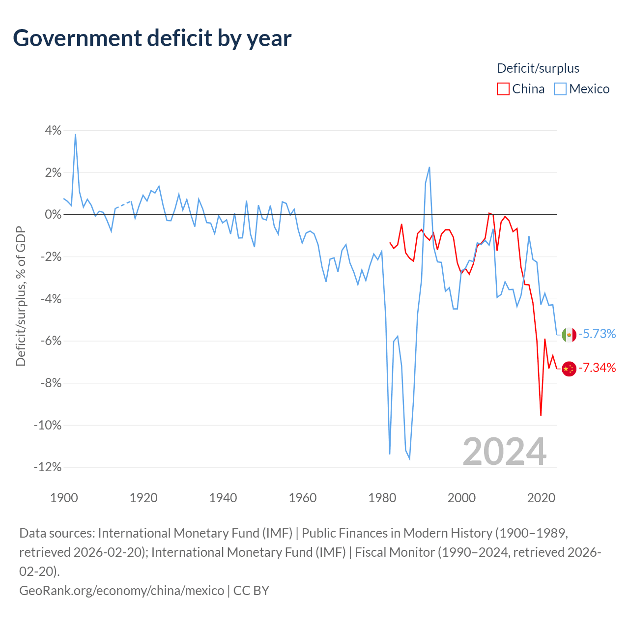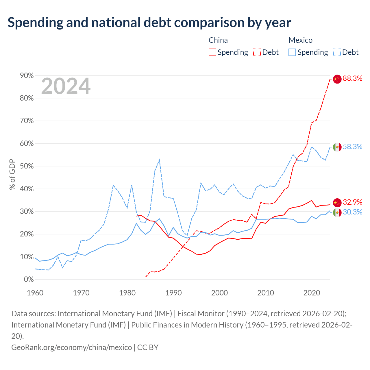 China has $16.6T in government debt (88.3% of GDP), compared to $1.08T (58.3% of GDP) in Mexico.