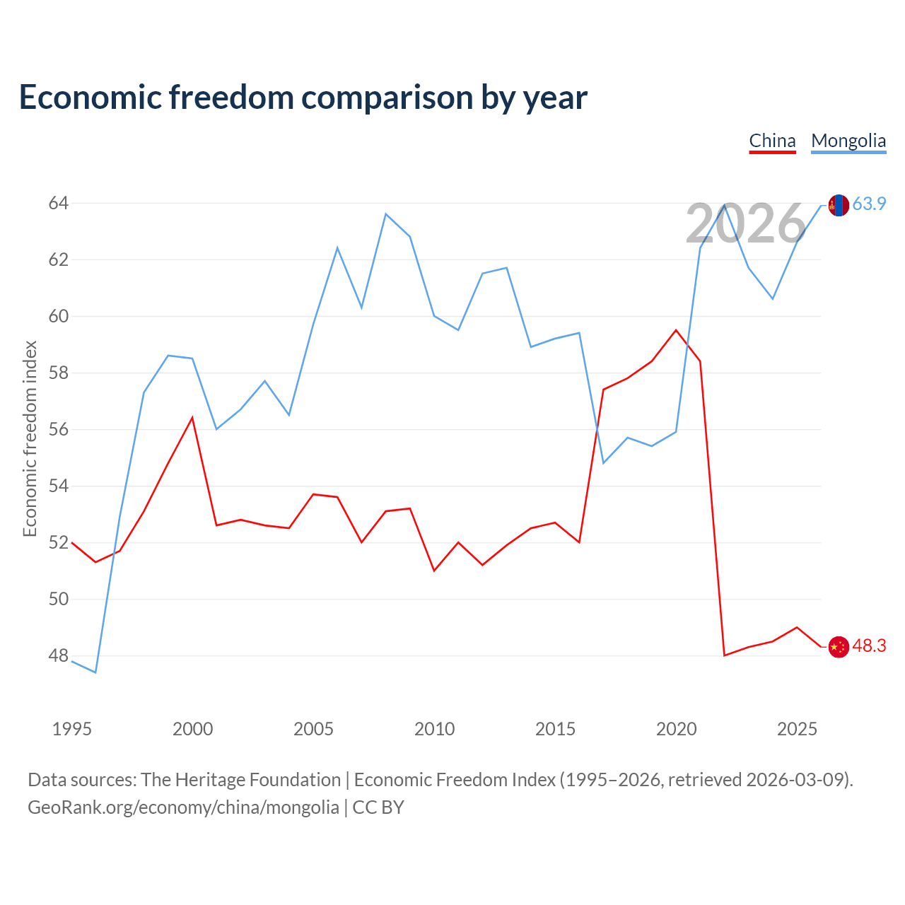 Data sources: The Heritage Foundation | Economic Freedom Index (1995–2026, retrieved 2026-03-09).