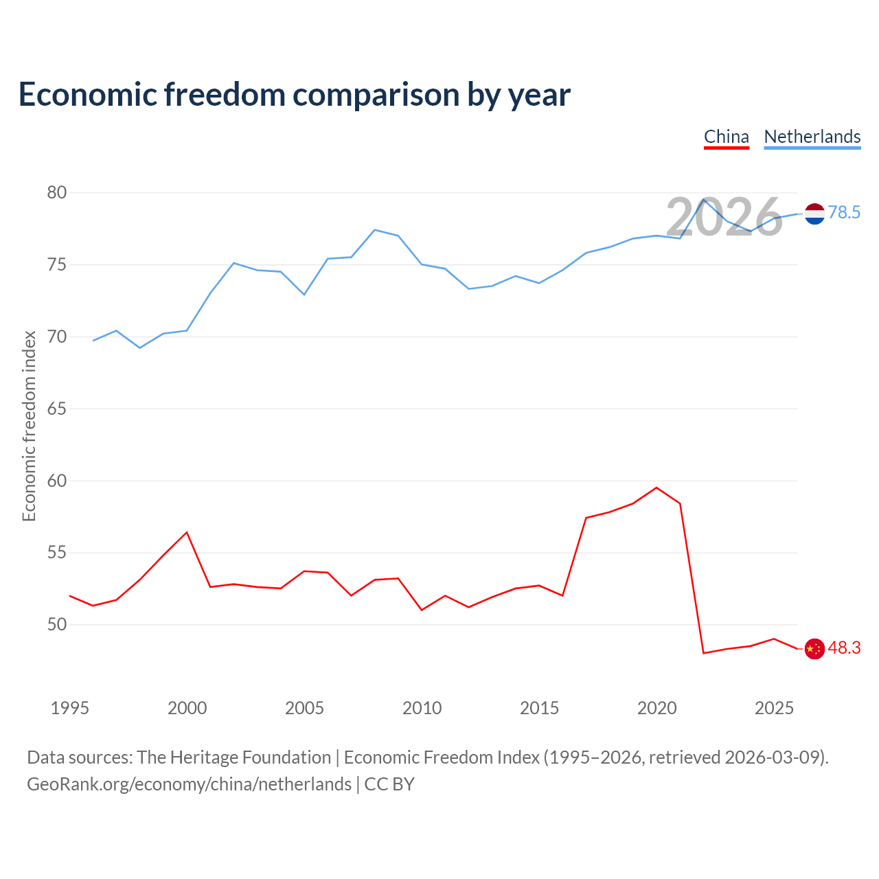 The Economic Freedom Index for China is 48.3, ranking 170/197, compared to 78.5 for the Netherlands, ranking 11/197. The chart above displays a comparison of annual changes in economic freedom indexes.