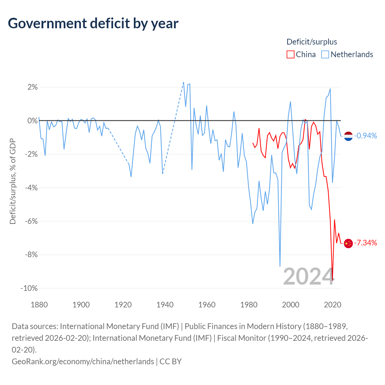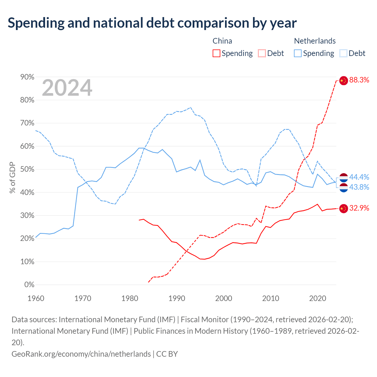 China has $16.6T in government debt (88.3% of GDP), compared to $532B (43.8% of GDP) in the Netherlands.