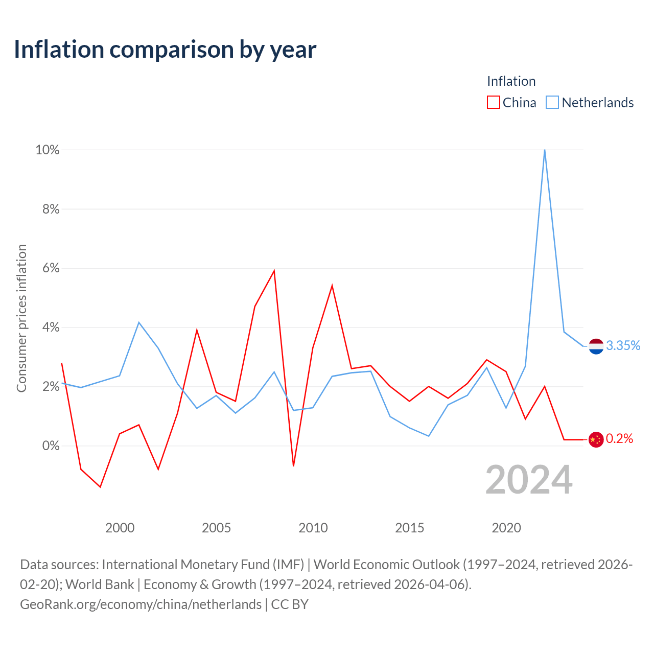 China has a GDP of $18.7T compared to $1.21T for the Netherlands, ranking 2/197 and 19/197 by economy size, respectively.