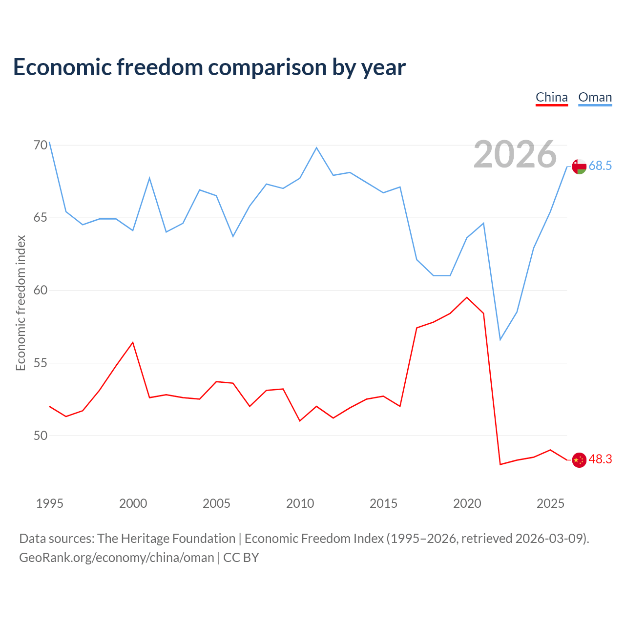 The Economic Freedom Index for China is 48.3, ranking 170/197, compared to 68.5 for Oman, ranking 45/197. The chart above displays a comparison of annual changes in economic freedom indexes.