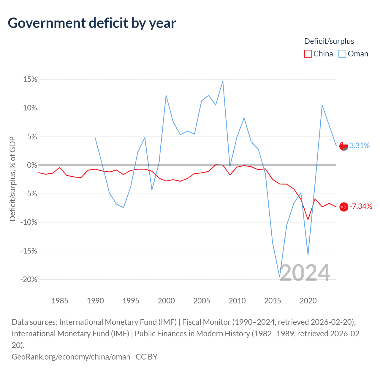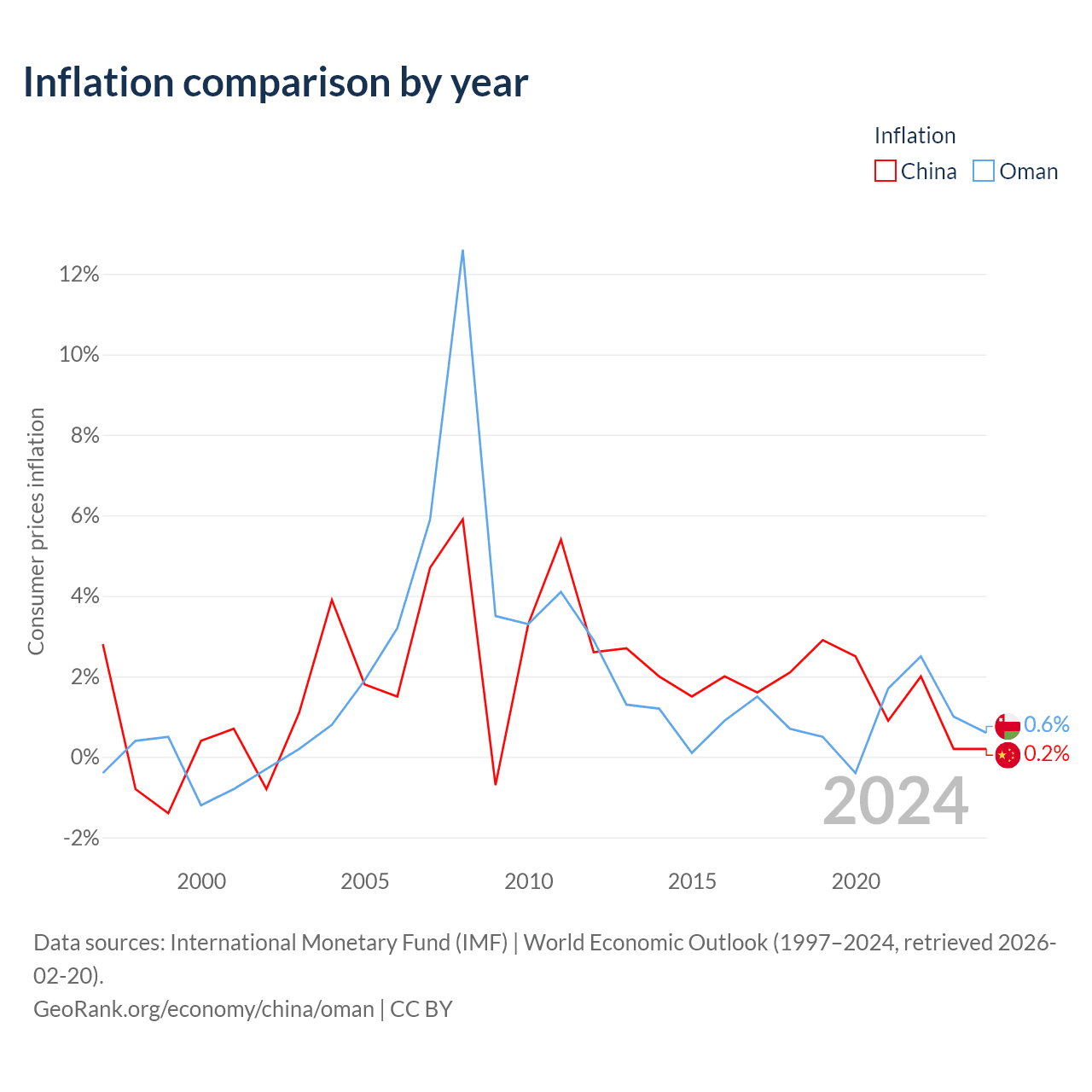 China has a GDP of $18.7T compared to $107B for Oman, ranking 2/197 and 70/197 by economy size, respectively.