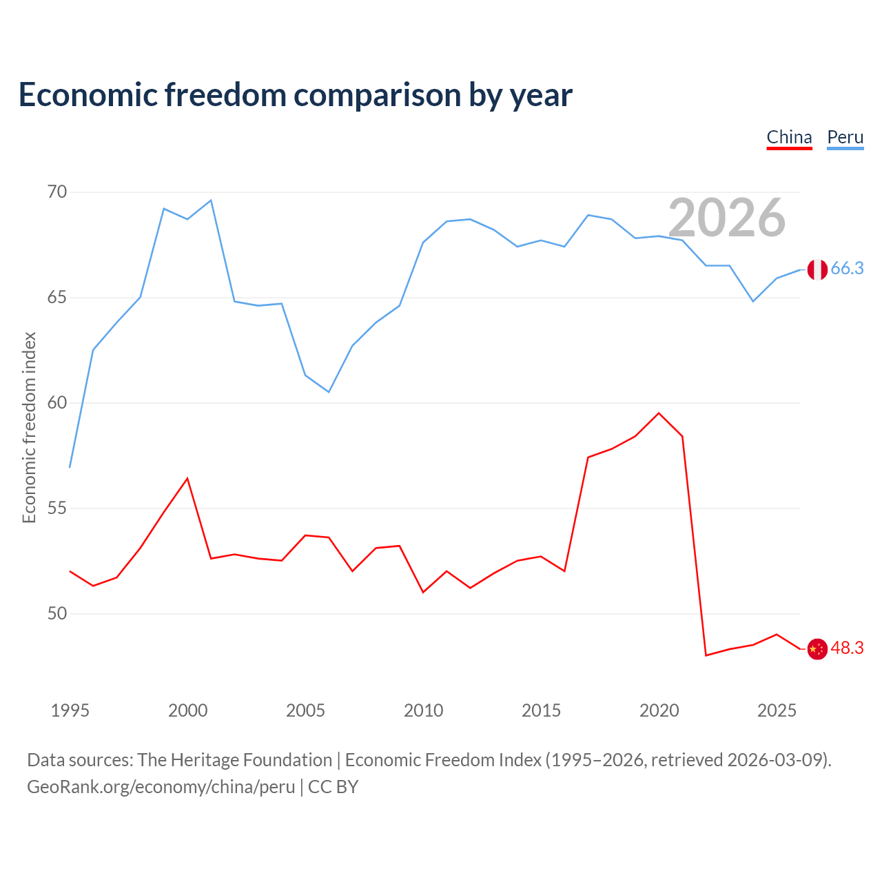 The Economic Freedom Index for China is 48.3, ranking 170/197, compared to 66.3 for Peru, ranking 62/197. The chart above displays a comparison of annual changes in economic freedom indexes.