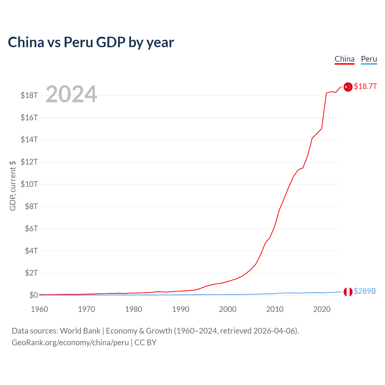 China has a GDP of $18.7T compared to $289B for Peru, ranking 2/197 and 49/197 by economy size, respectively.
