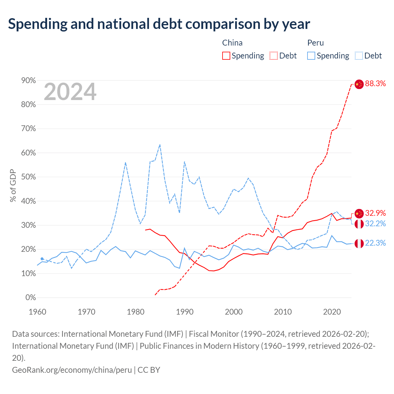 China has $16.6T in government debt (88.3% of GDP), compared to $93B (32.2% of GDP) in Peru.