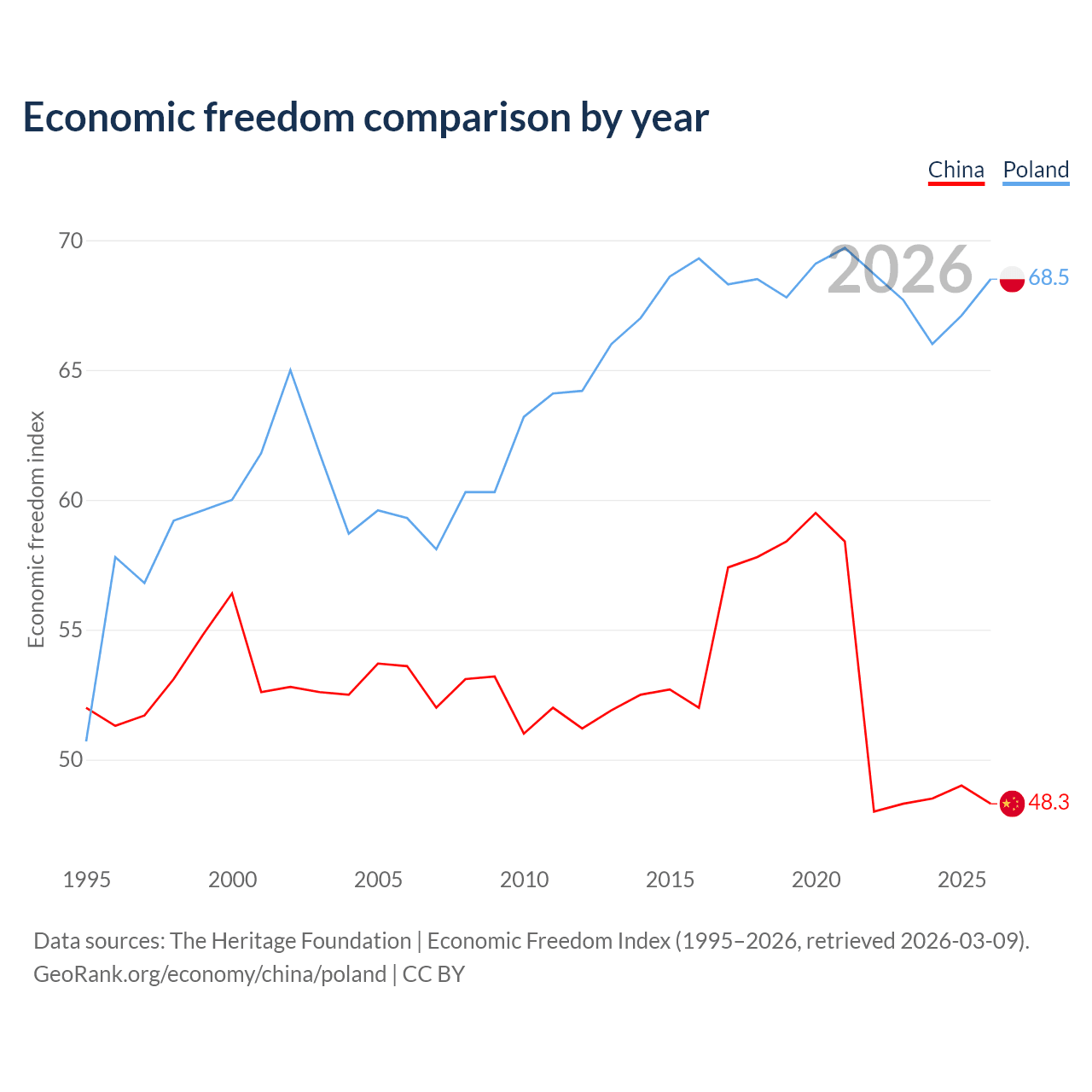The Economic Freedom Index for China is 48.3, ranking 170/197, compared to 68.5 for Poland, ranking 46/197. The chart above displays a comparison of annual changes in economic freedom indexes.