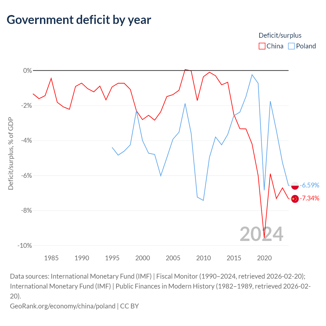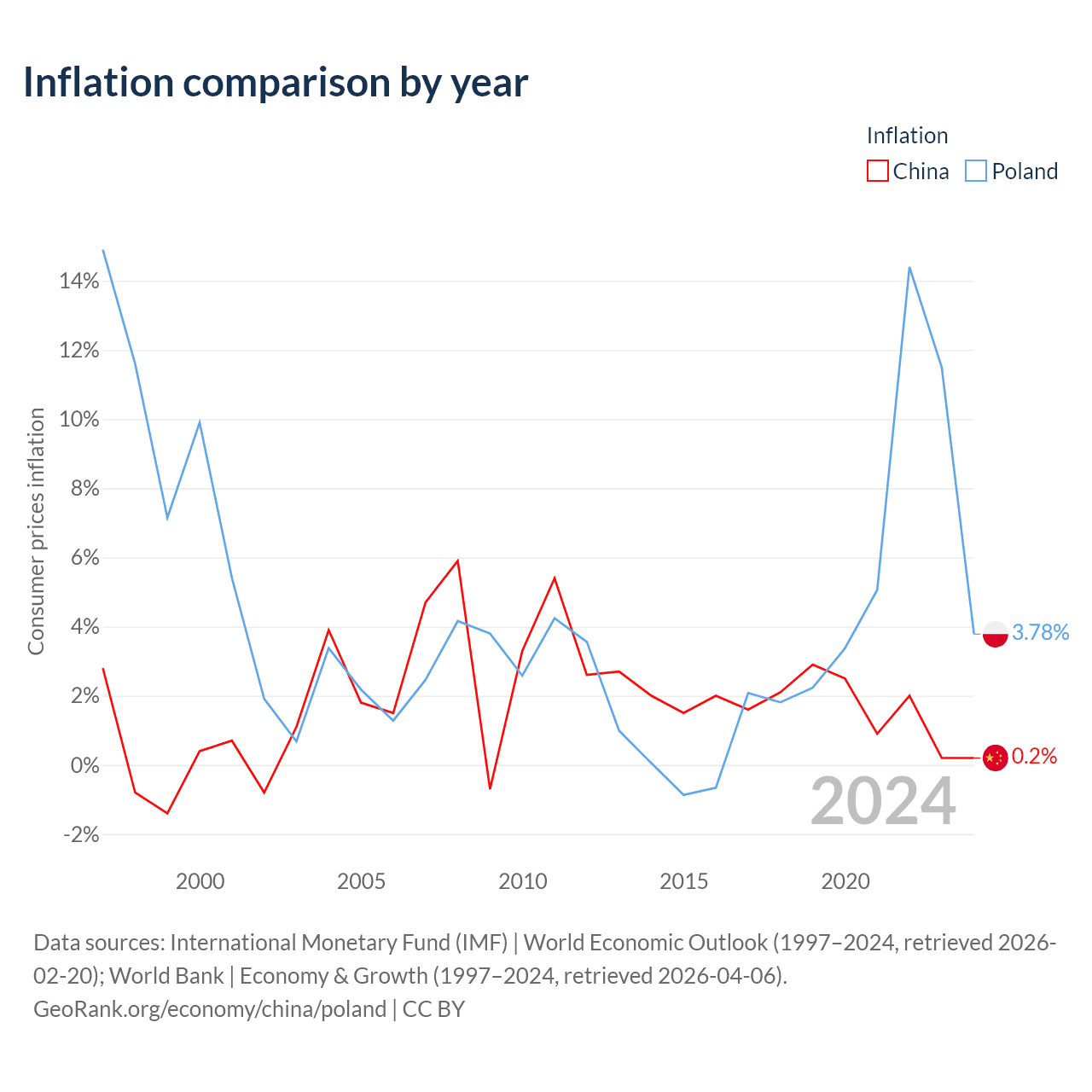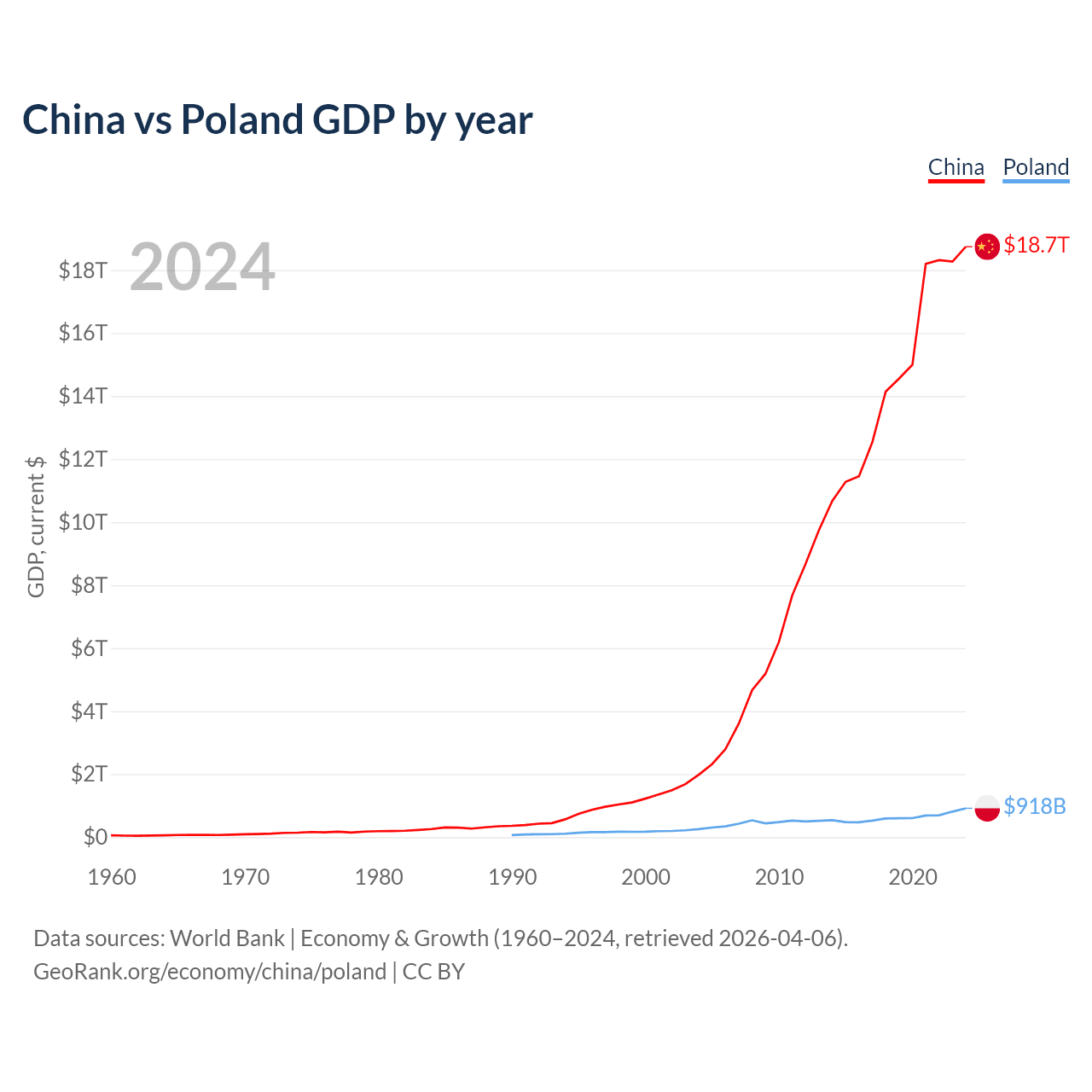 China has a GDP of $18.7T compared to $918B for Poland, ranking 2/197 and 21/197 by economy size, respectively.