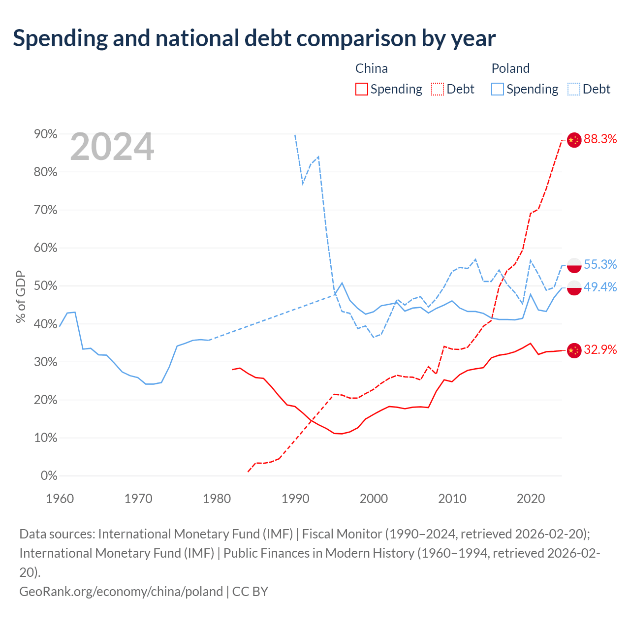 China has $16.6T in government debt (88.3% of GDP), compared to $507B (55.3% of GDP) in Poland.