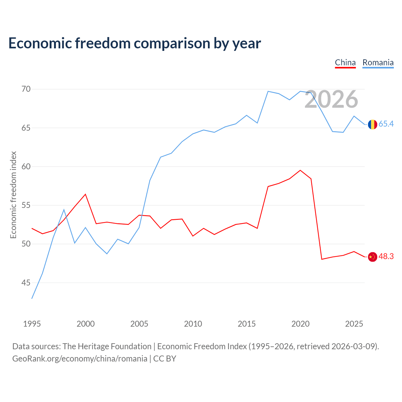 The Economic Freedom Index for China is 48.3, ranking 170/197, compared to 65.4 for Romania, ranking 64/197. The chart above displays a comparison of annual changes in economic freedom indexes.