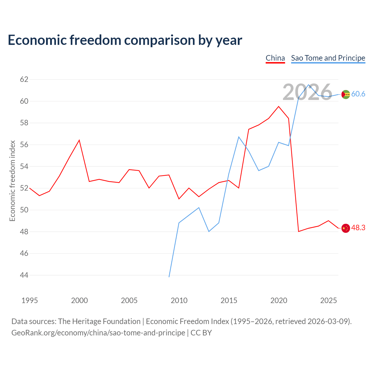 The Economic Freedom Index for China is 48.3, ranking 170/197, compared to 60.6 for Sao Tome and Principe, ranking 93/197. The chart above displays a comparison of annual changes in economic freedom indexes.