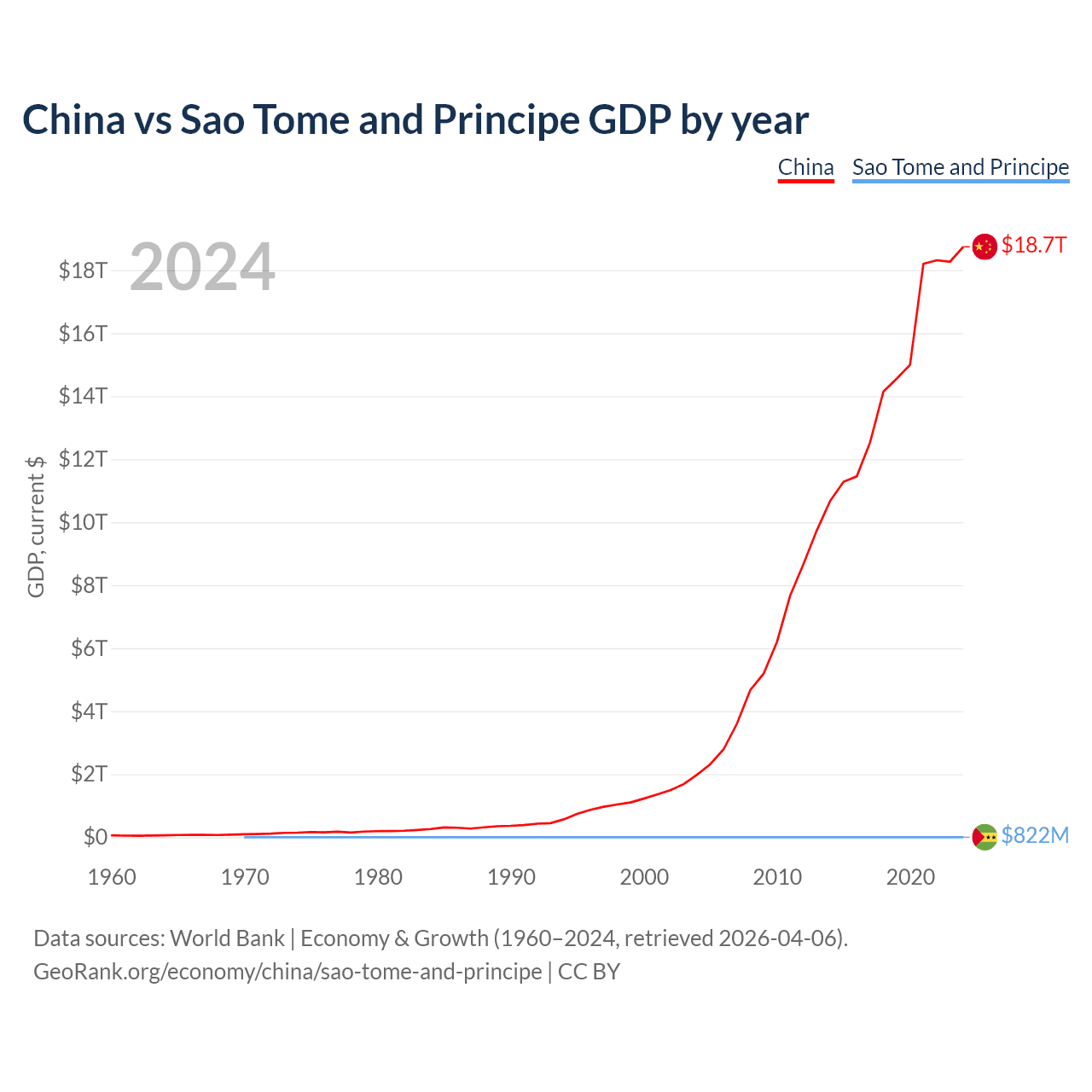 China has a GDP of $18.7T compared to $822M for Sao Tome and Principe, ranking 2/197 and 189/197 by economy size, respectively.