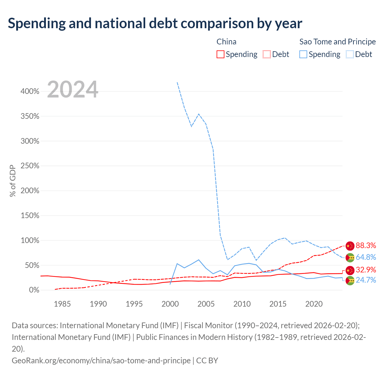 China has $16.6T in government debt (88.3% of GDP), compared to $533M (64.8% of GDP) in Sao Tome and Principe.
