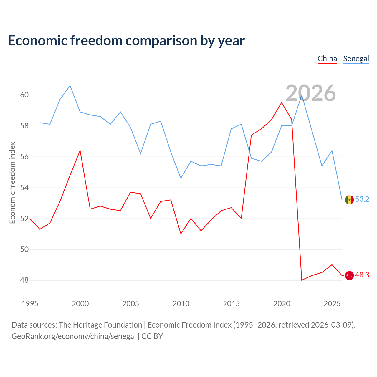 The Economic Freedom Index for China is 48.3, ranking 170/197, compared to 53.2 for Senegal, ranking 140/197. The chart above displays a comparison of annual changes in economic freedom indexes.