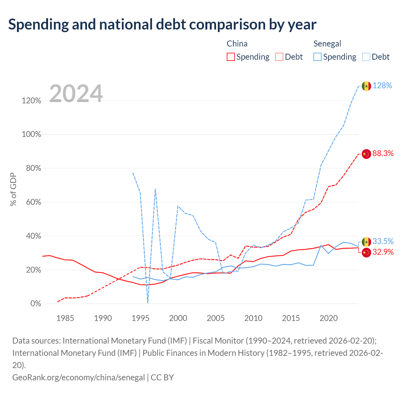 China has $16.6T in government debt (88.3% of GDP), compared to $42.1B (128.4% of GDP) in Senegal.