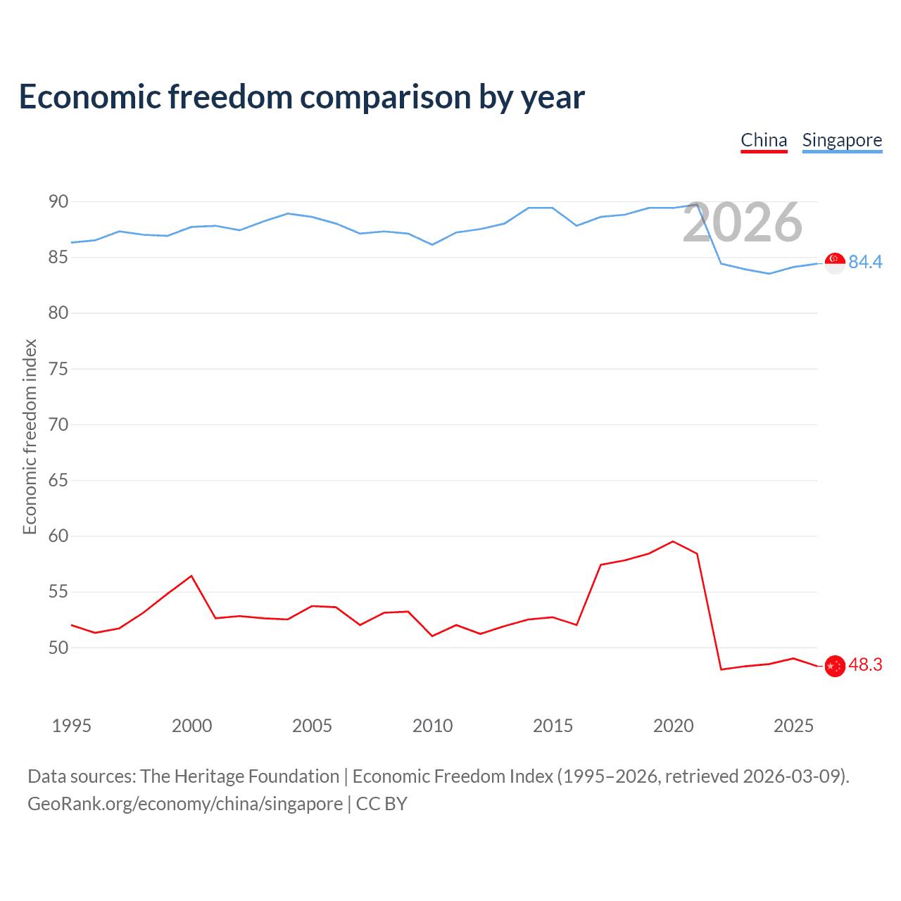 The Economic Freedom Index for China is 48.3, ranking 170/197, compared to 84.4 for Singapore, ranking 1/197. The chart above displays a comparison of annual changes in economic freedom indexes.
