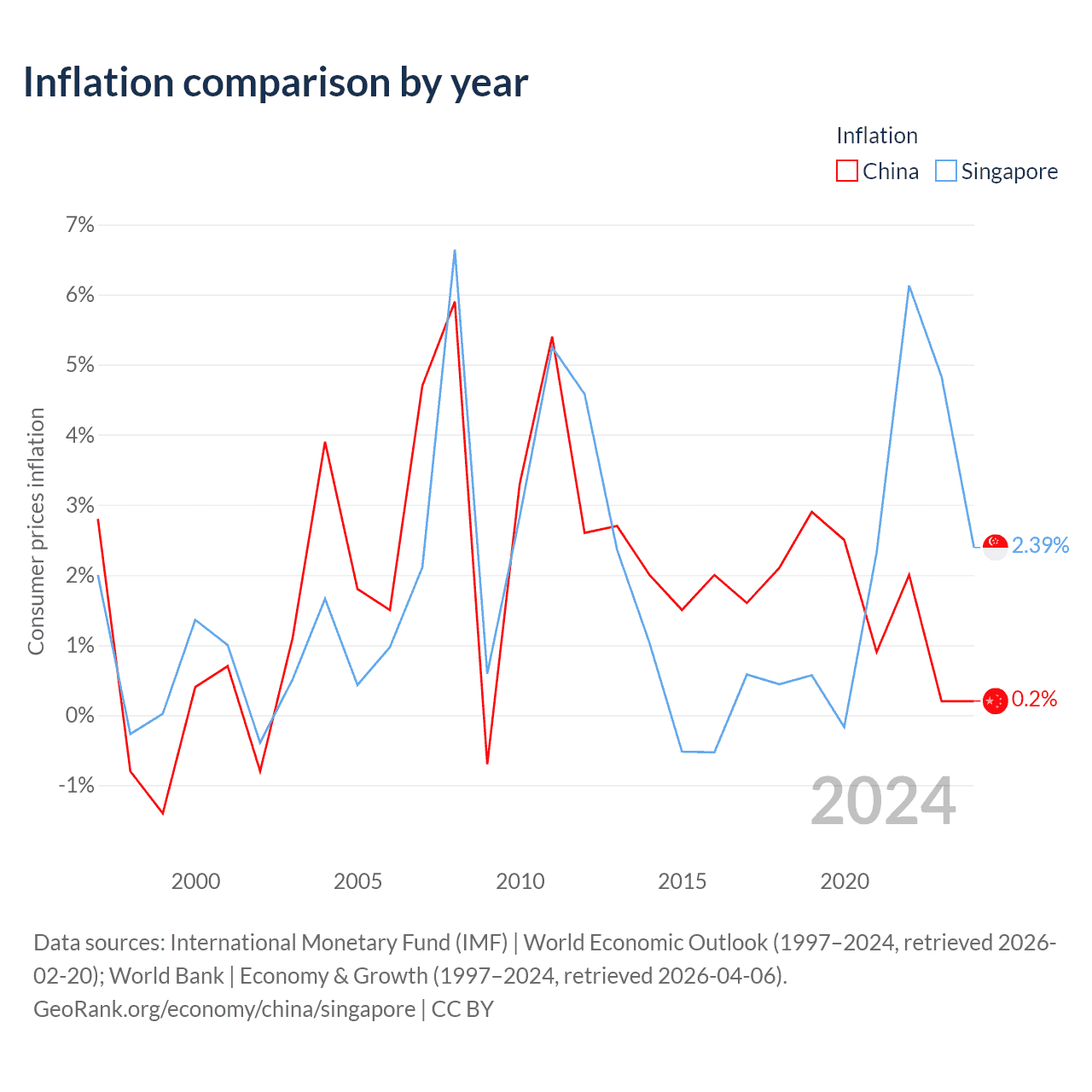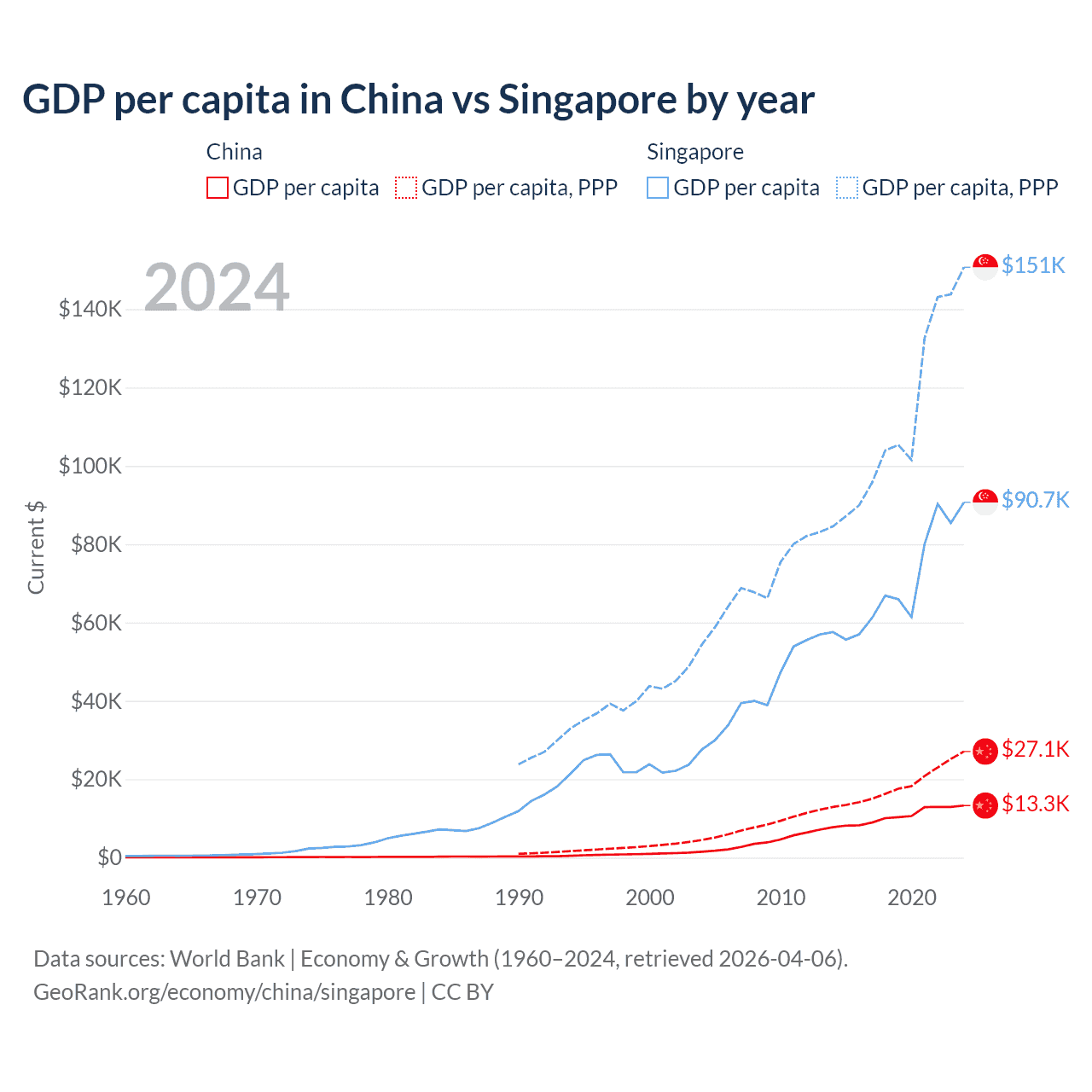 China has a GDP of $18.7T compared to $547B for Singapore, ranking 2/197 and 28/197 by economy size, respectively.