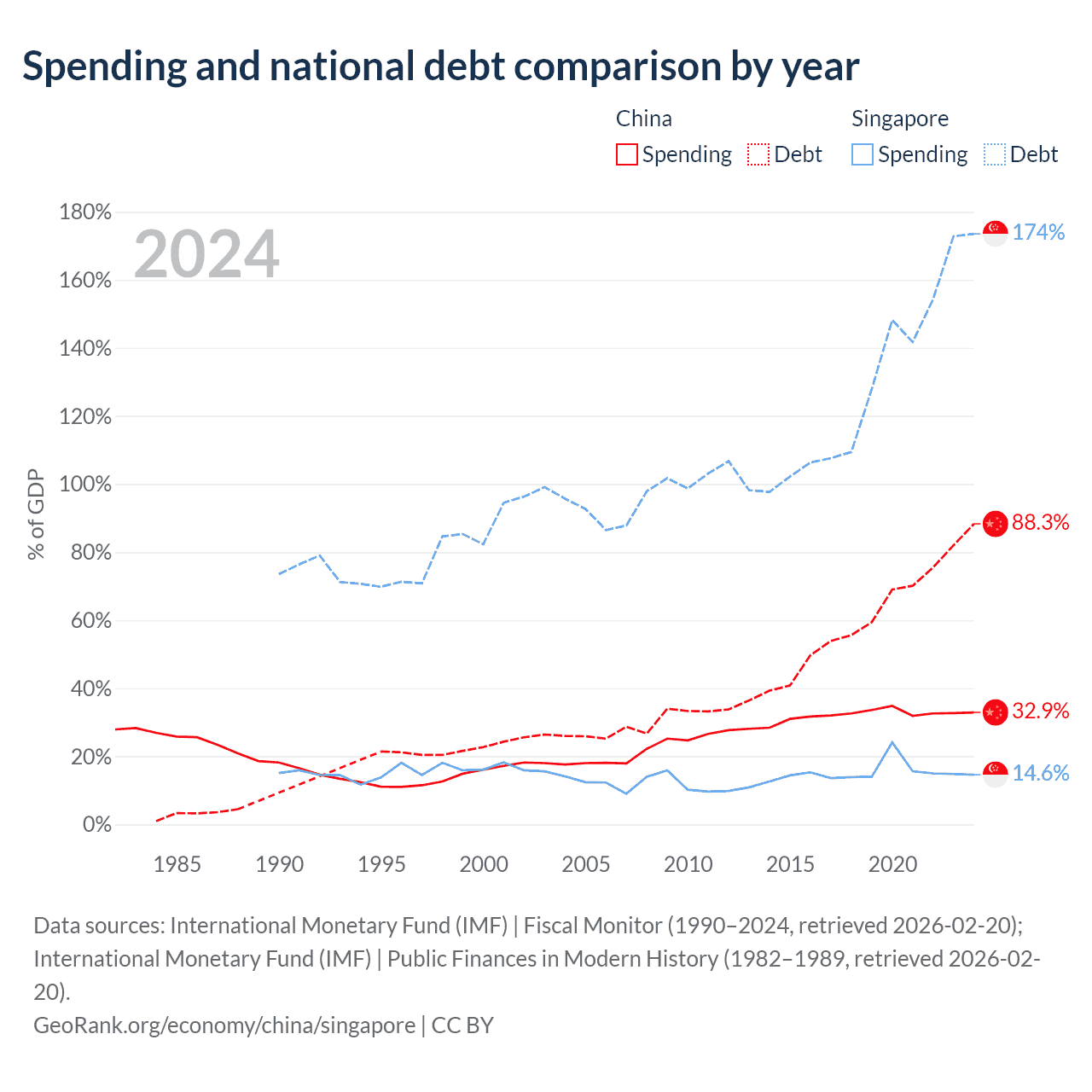 China has $16.6T in government debt (88.3% of GDP), compared to $950B (173.5% of GDP) in Singapore.
