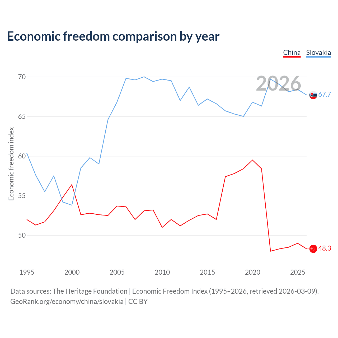 The Economic Freedom Index for China is 48.3, ranking 170/197, compared to 67.7 for Slovakia, ranking 54/197. The chart above displays a comparison of annual changes in economic freedom indexes.