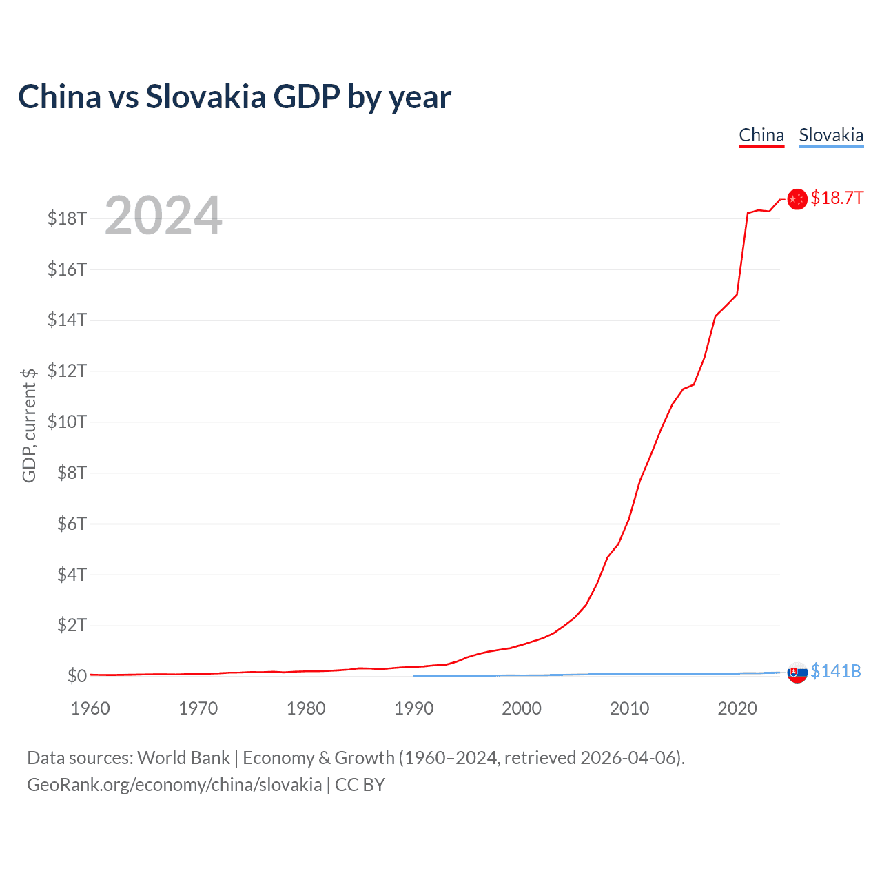 China has a GDP of $18.7T compared to $141B for Slovakia, ranking 2/197 and 61/197 by economy size, respectively.