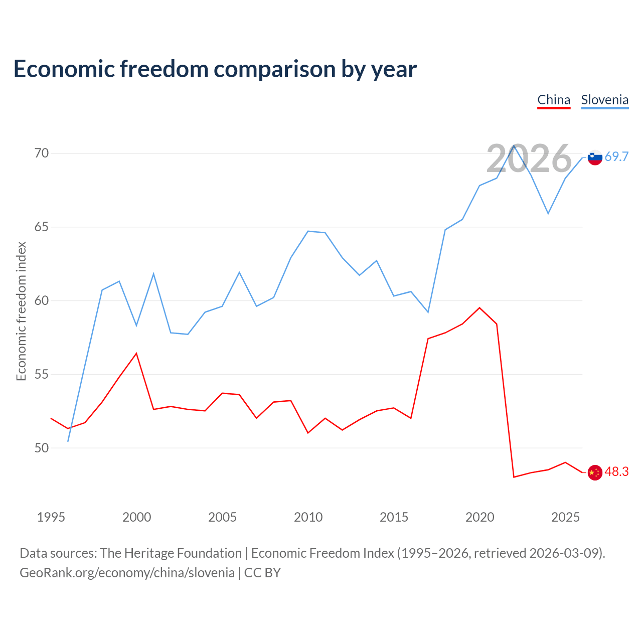 The Economic Freedom Index for China is 48.3, ranking 170/197, compared to 69.7 for Slovenia, ranking 40/197. The chart above displays a comparison of annual changes in economic freedom indexes.