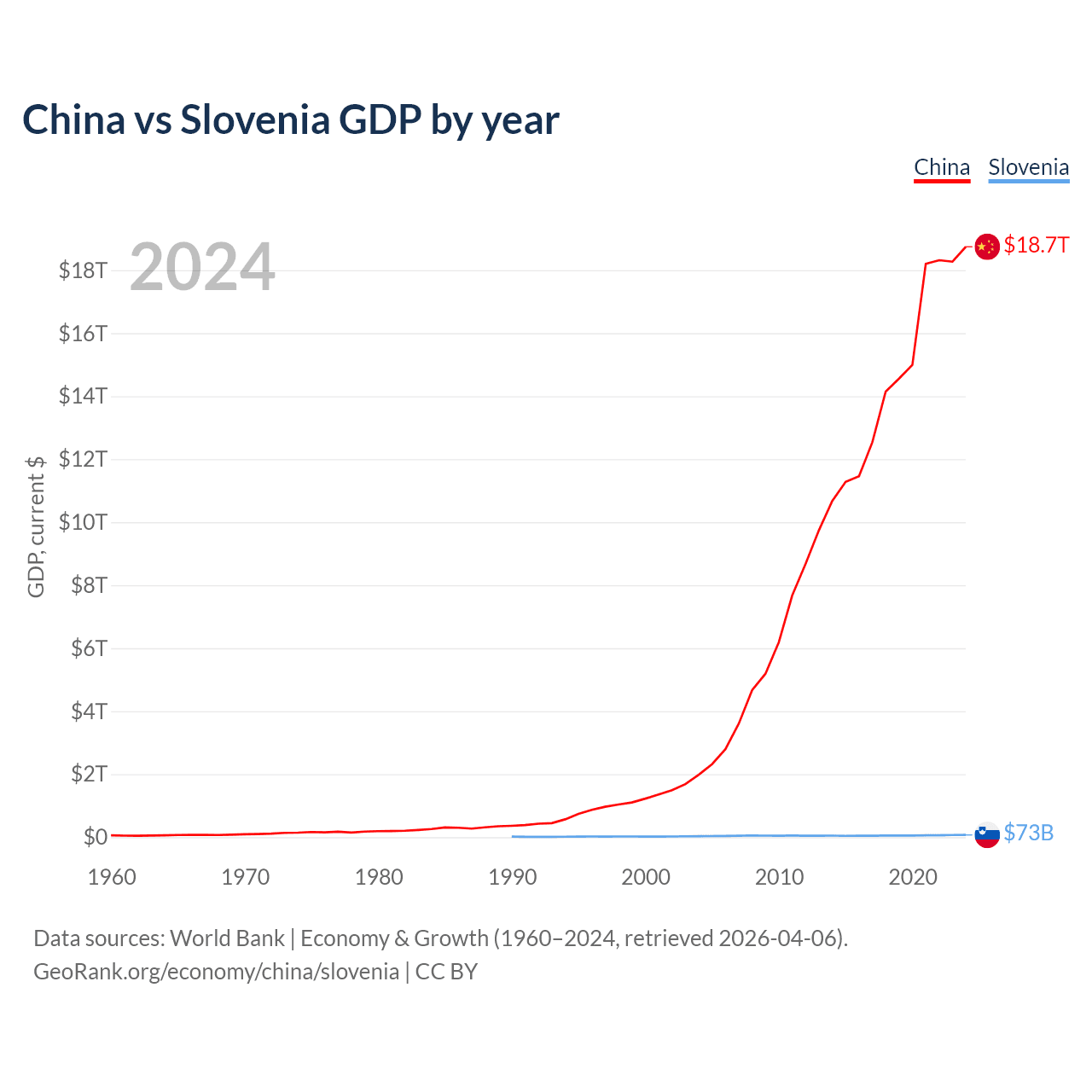 China has a GDP of $18.7T compared to $73B for Slovenia, ranking 2/197 and 86/197 by economy size, respectively.