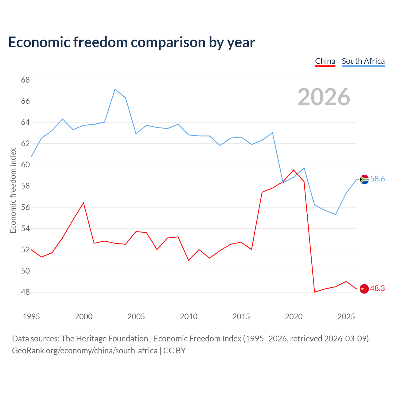 The Economic Freedom Index for China is 48.3, ranking 170/197, compared to 58.6 for South Africa, ranking 110/197. The chart above displays a comparison of annual changes in economic freedom indexes.
