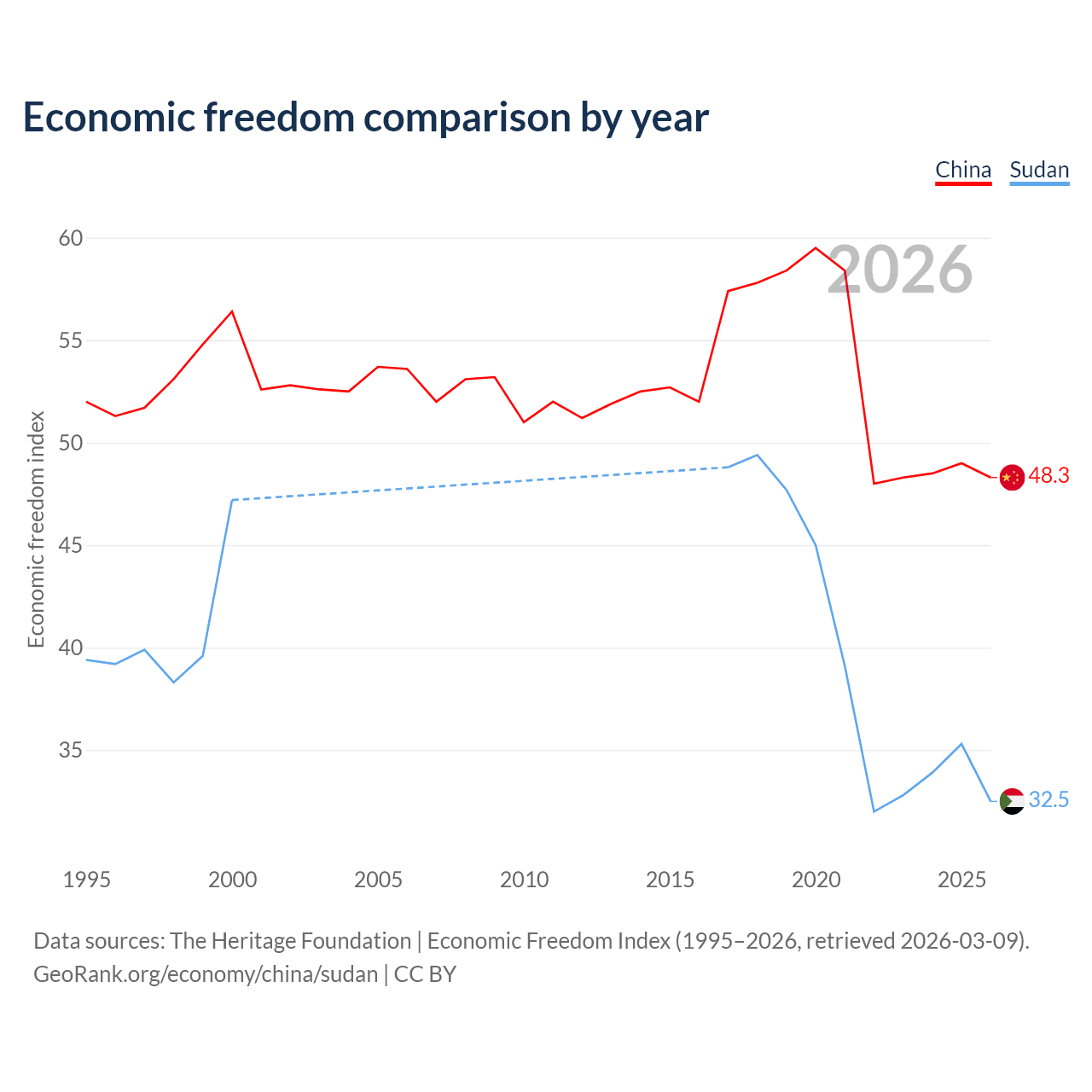 The Economic Freedom Index for China is 48.3, ranking 170/197, compared to 32.5 for Sudan, ranking 191/197. The chart above displays a comparison of annual changes in economic freedom indexes.