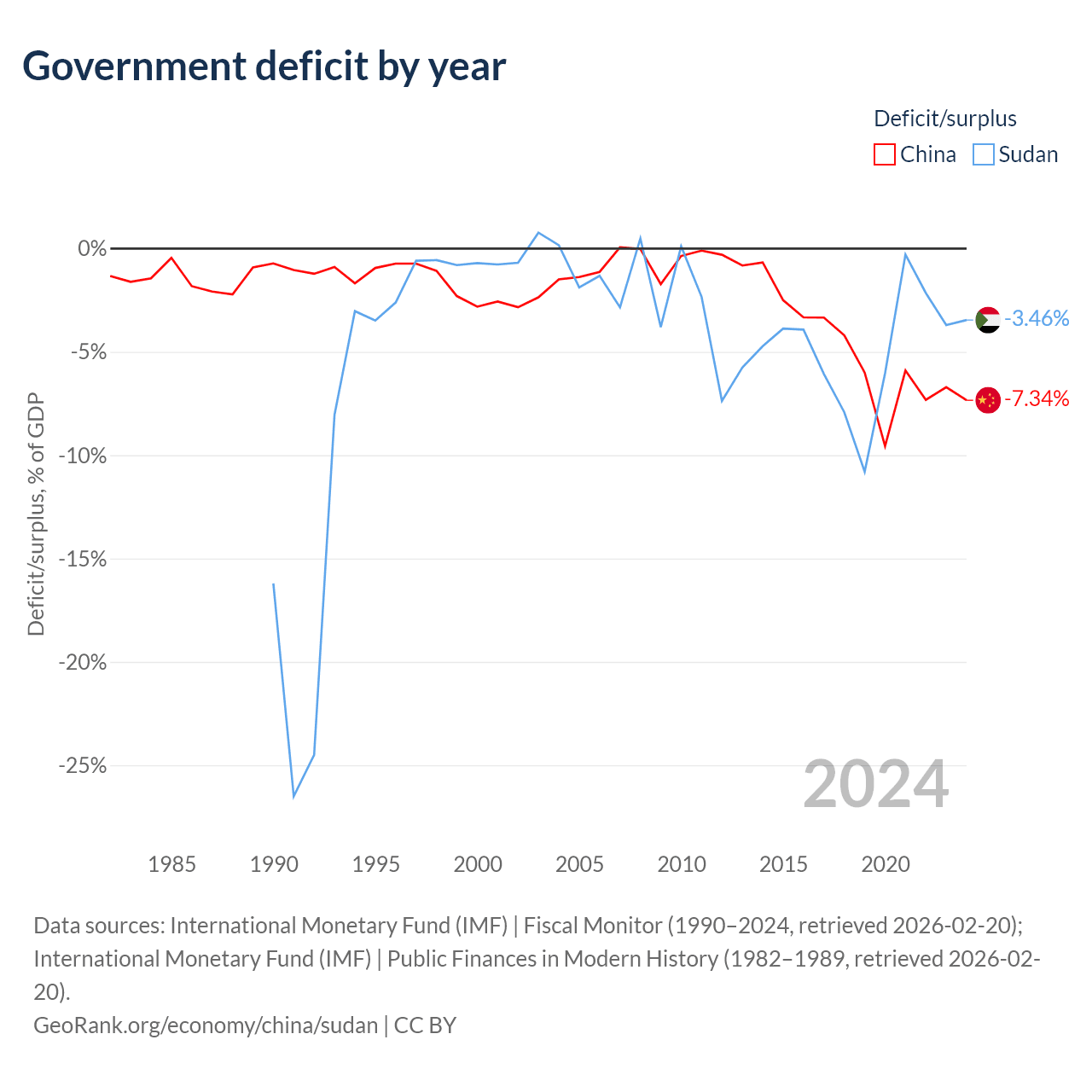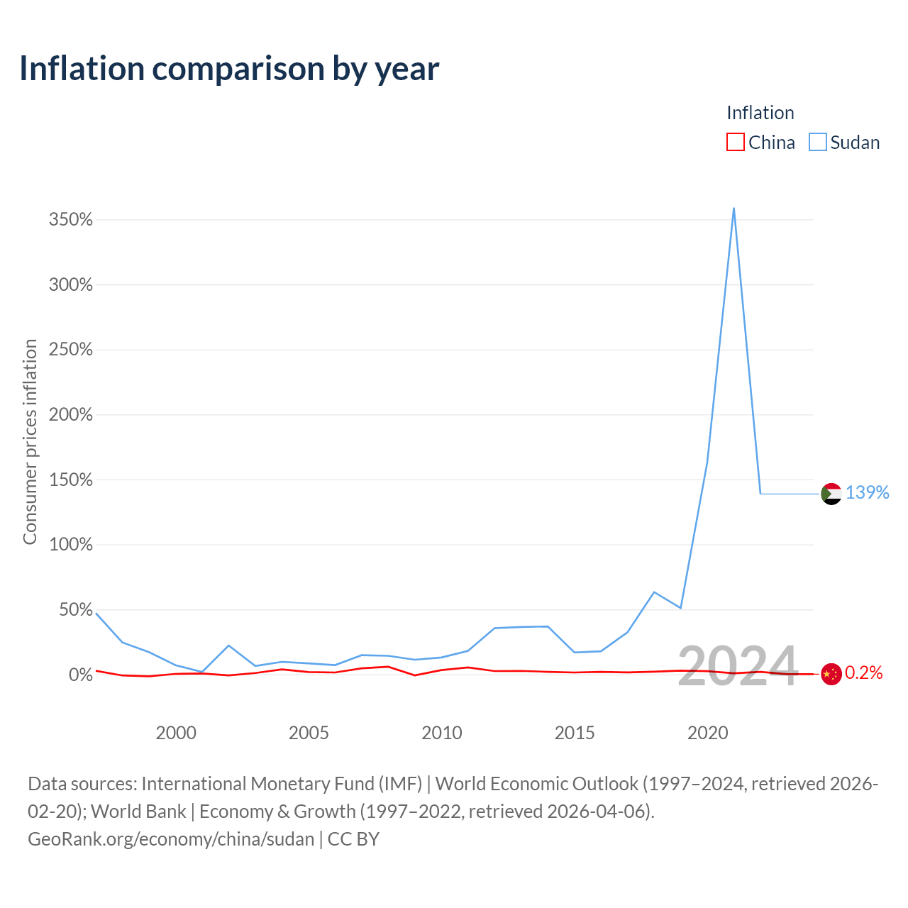 China has a GDP of $18.7T compared to $49.7B for Sudan, ranking 2/197 and 94/197 by economy size, respectively.