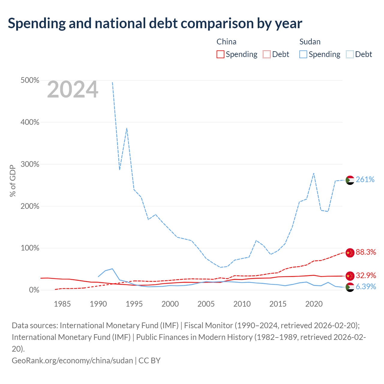 China has $16.6T in government debt (88.3% of GDP), compared to $130B (261.4% of GDP) in Sudan.