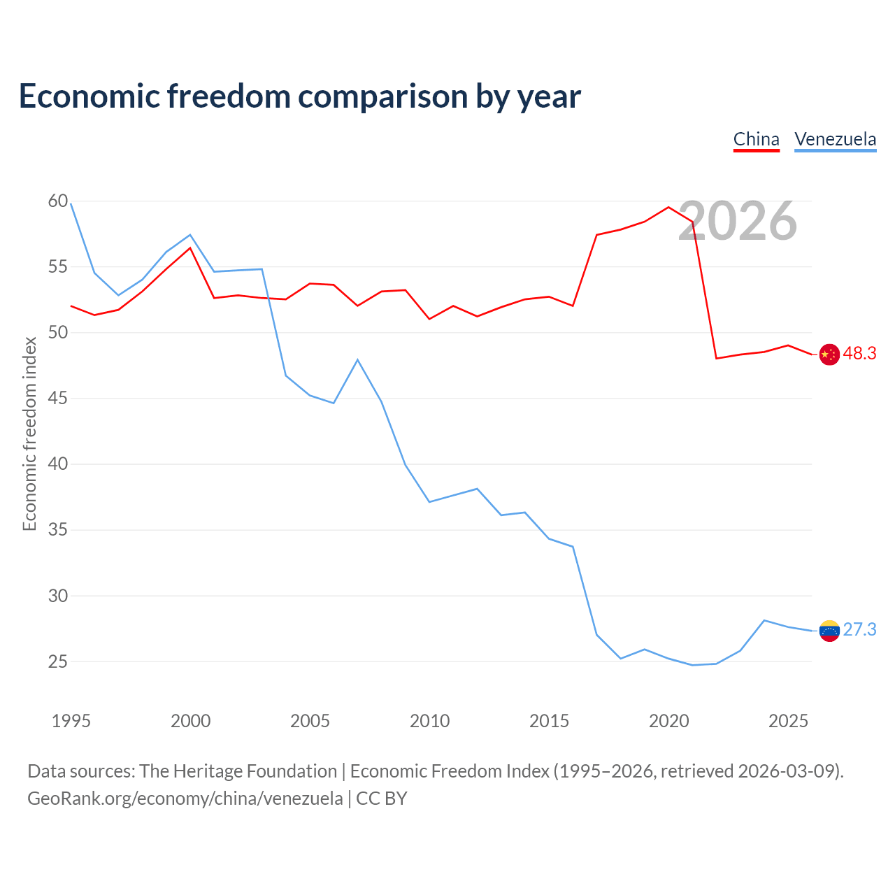 The Economic Freedom Index for China is 48.3, ranking 170/197, compared to 27.3 for Venezuela, ranking 194/197. The chart above displays a comparison of annual changes in economic freedom indexes.