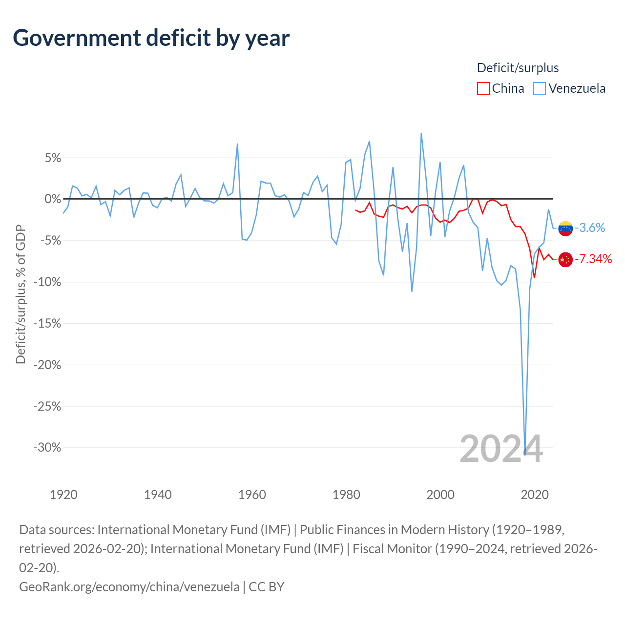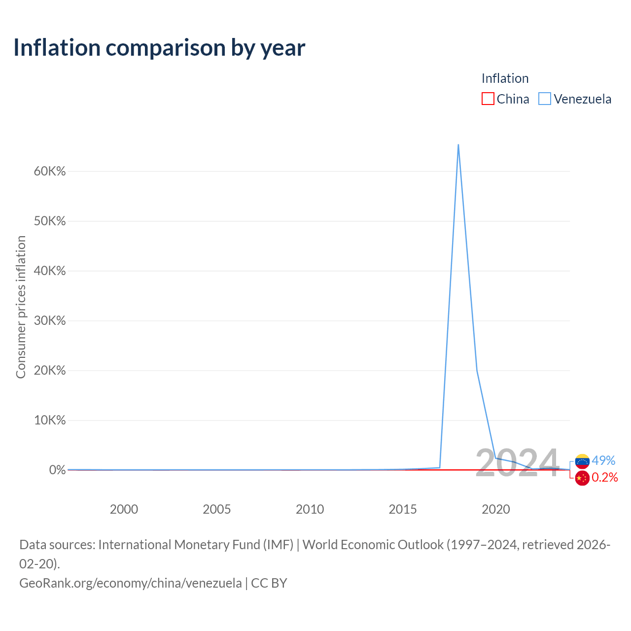 China has a GDP of $18.7T compared to $120B for Venezuela, ranking 2/197 and 65/197 by economy size, respectively.
