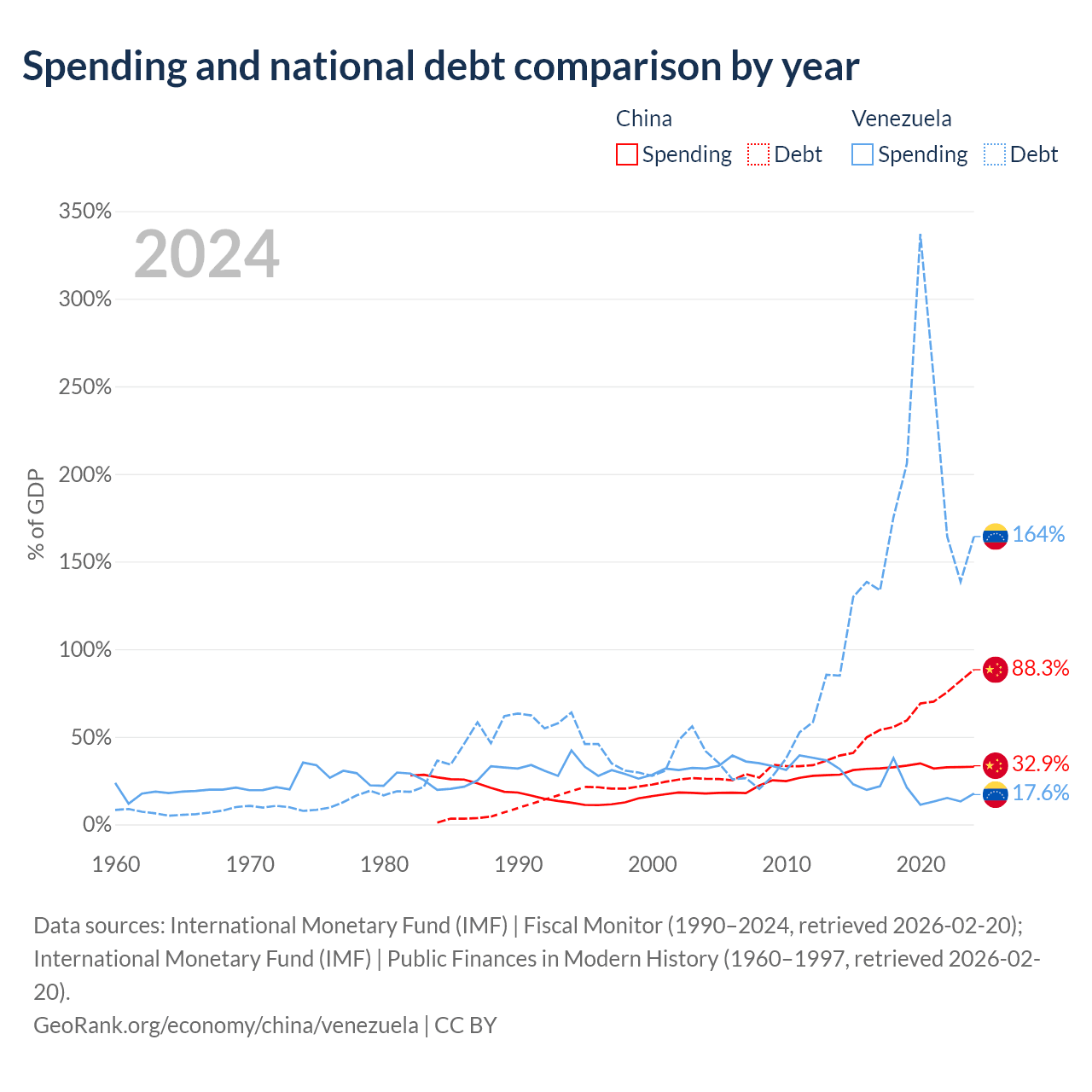 China has $16.6T in government debt (88.3% of GDP), compared to $197B (164.3% of GDP) in Venezuela.