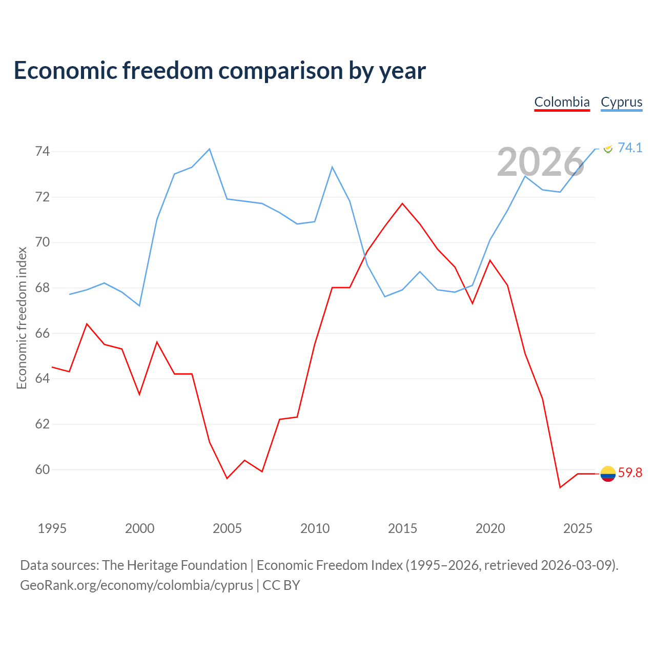 The Economic Freedom Index for Colombia is 59.8, ranking 101/197, compared to 74.1 for Cyprus, ranking 21/197. The chart above displays a comparison of annual changes in economic freedom indexes.