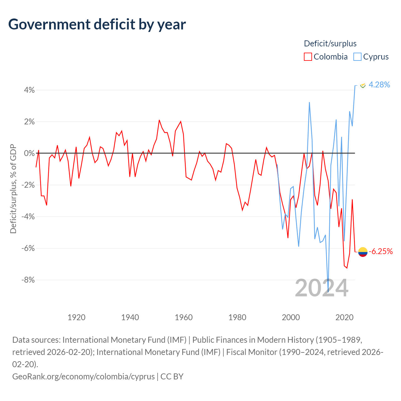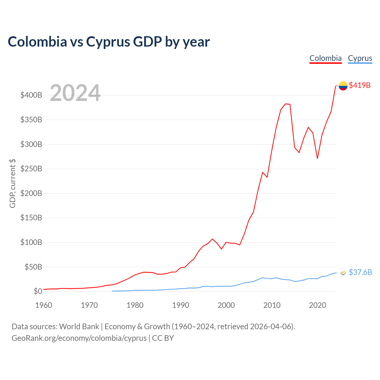 Colombia has a GDP of $419B compared to $37.6B for Cyprus, ranking 39/197 and 103/197 by economy size, respectively.