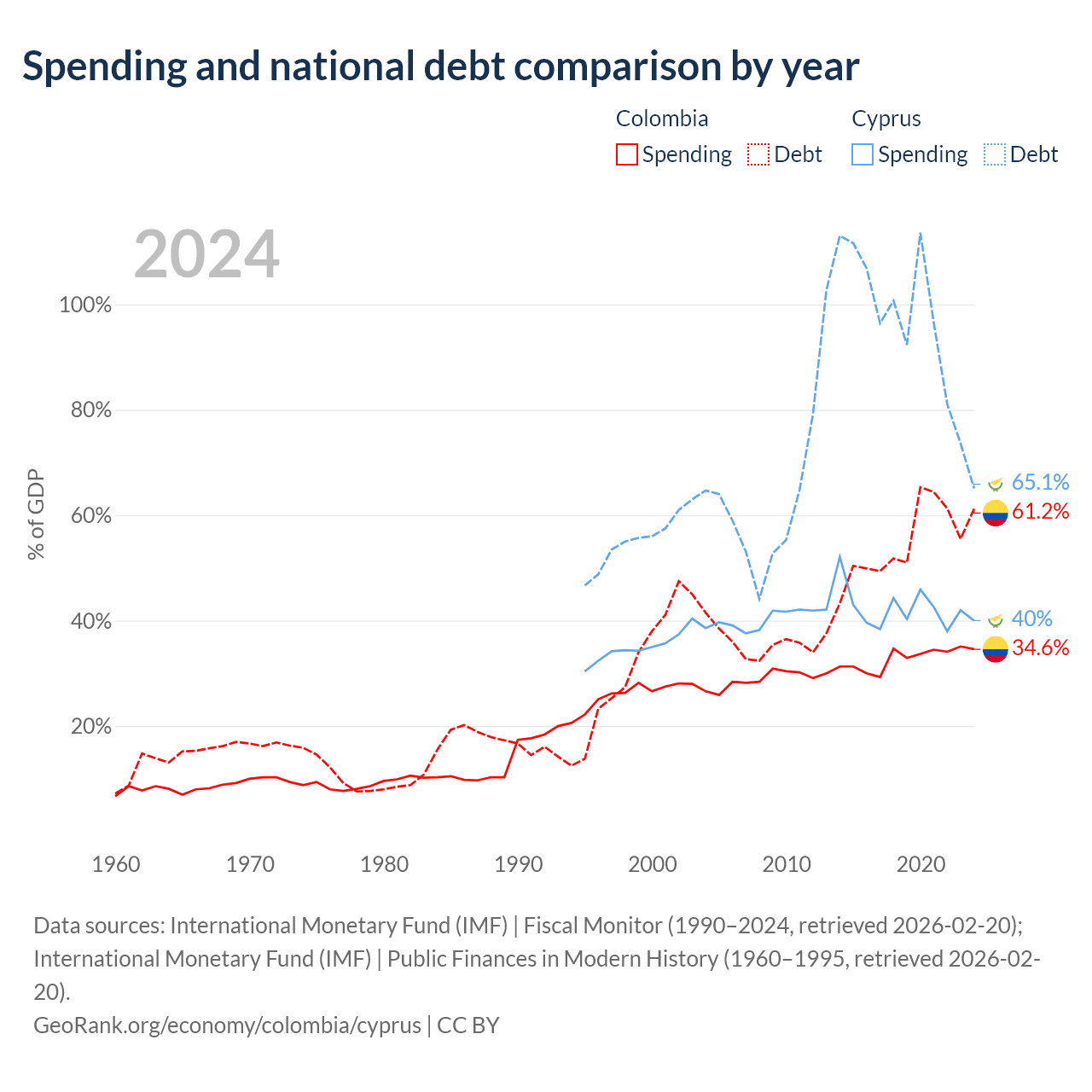 Colombia has $256B in government debt (61.2% of GDP), compared to $24.5B (65.1% of GDP) in Cyprus.
