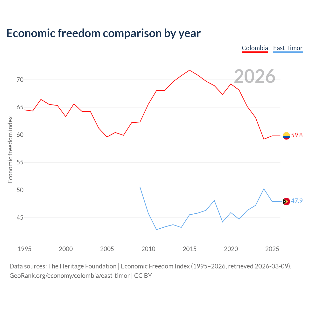 The Economic Freedom Index for Colombia is 59.8, ranking 101/197, compared to 47.9 for East Timor, ranking 173/197. The chart above displays a comparison of annual changes in economic freedom indexes.