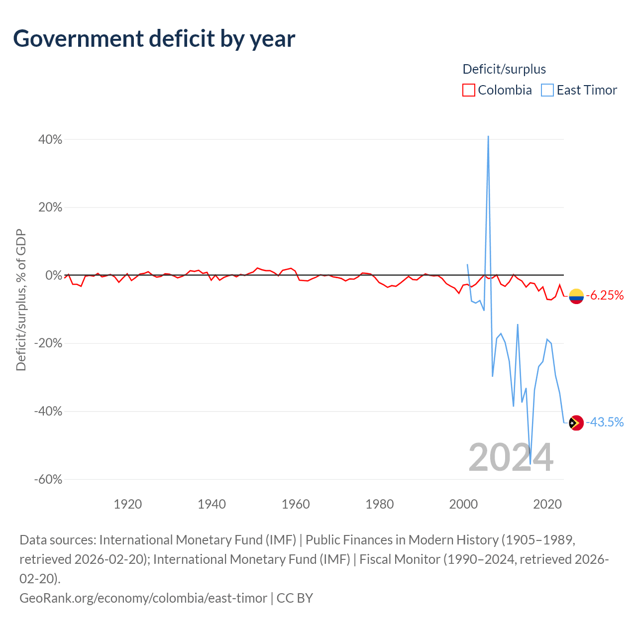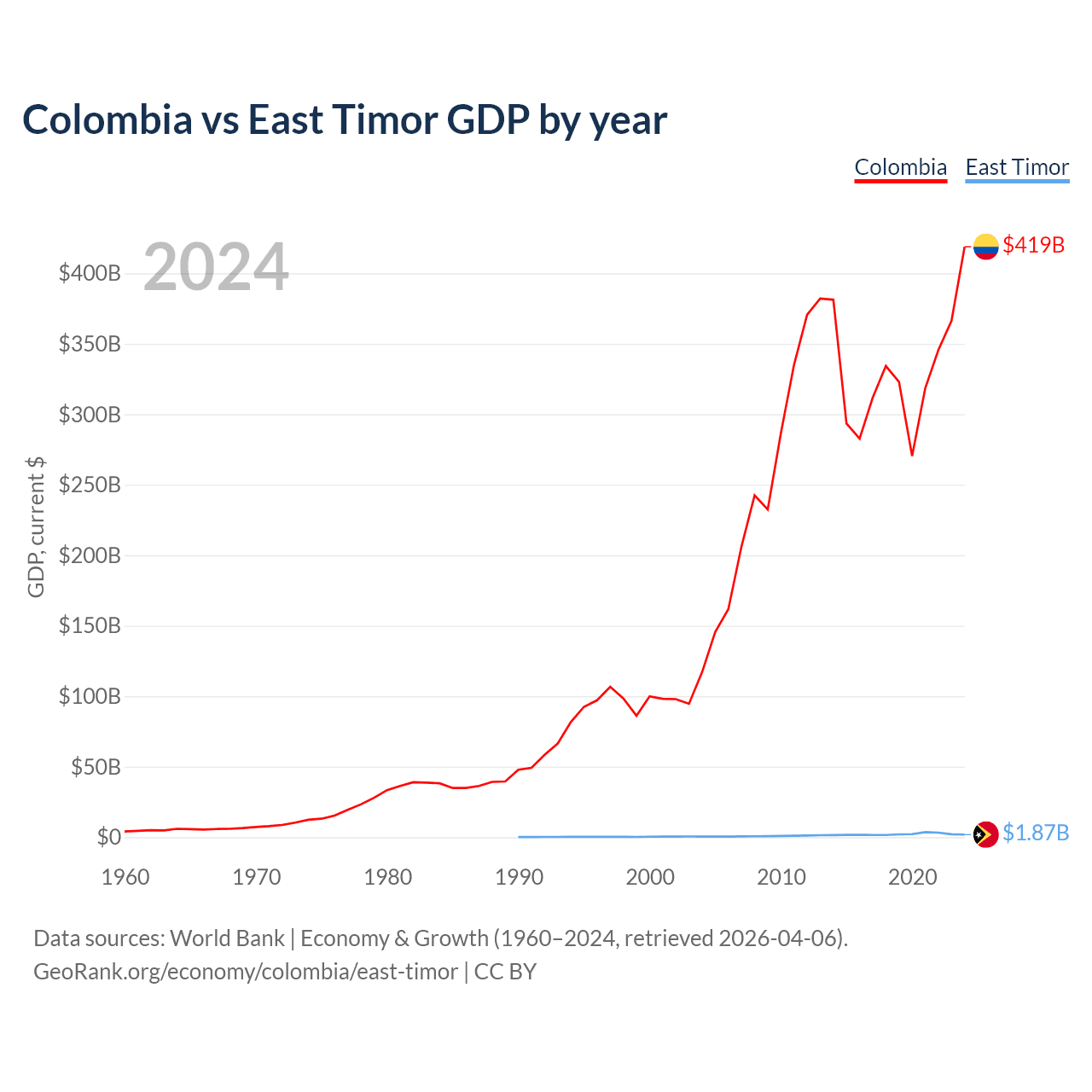 Colombia has a GDP of $419B compared to $1.87B for East Timor, ranking 39/197 and 181/197 by economy size, respectively.