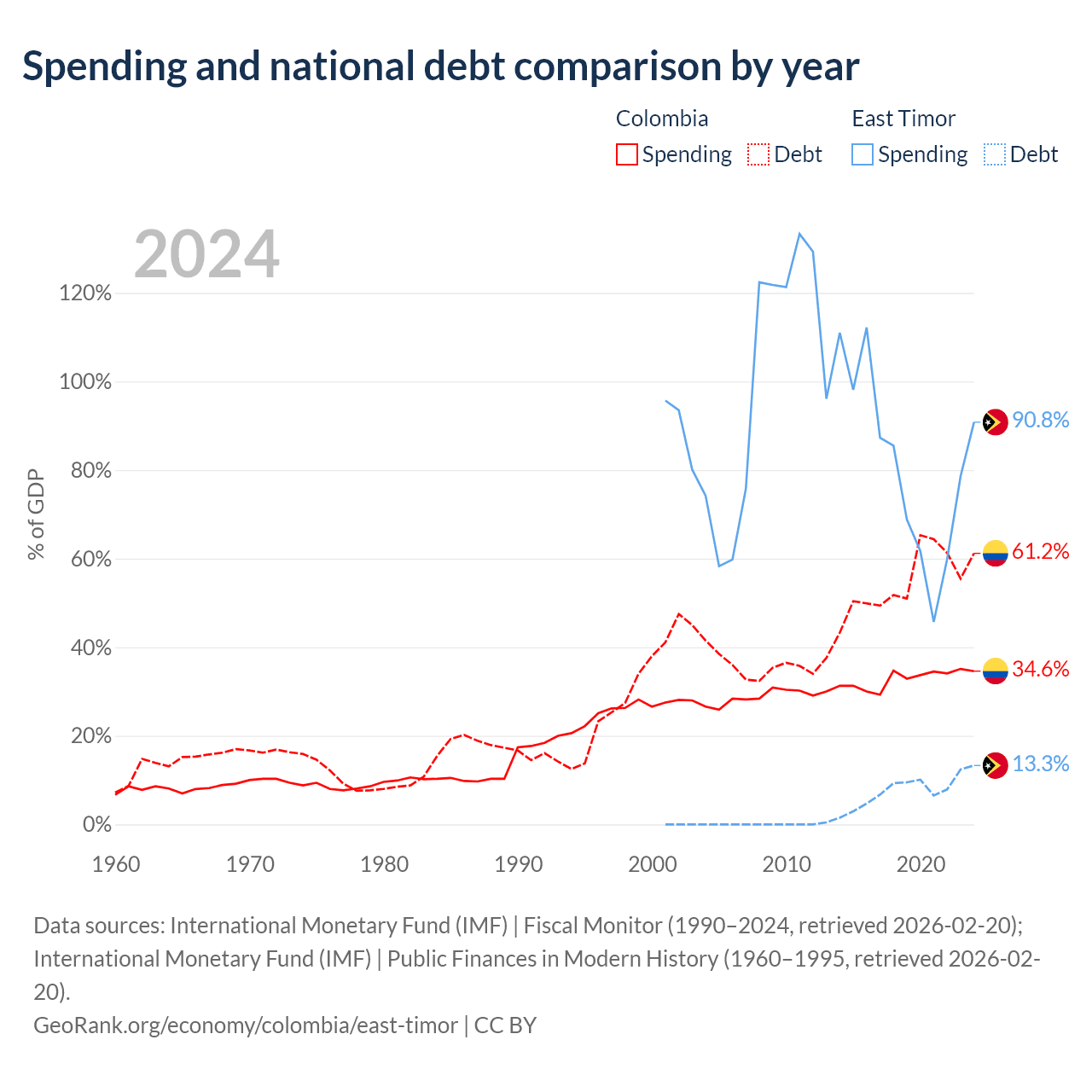 Colombia has $256B in government debt (61.2% of GDP), compared to $249M (13.3% of GDP) in East Timor.