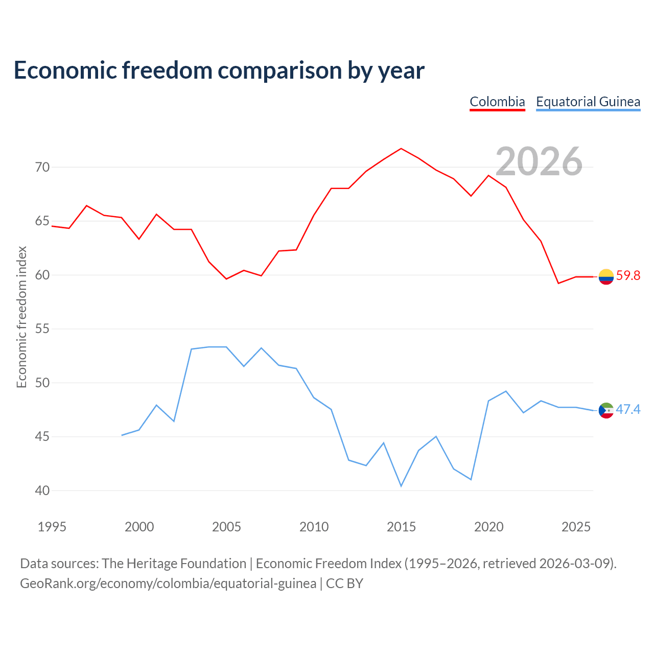 The Economic Freedom Index for Colombia is 59.8, ranking 101/197, compared to 47.4 for Equatorial Guinea, ranking 175/197. The chart above displays a comparison of annual changes in economic freedom indexes.