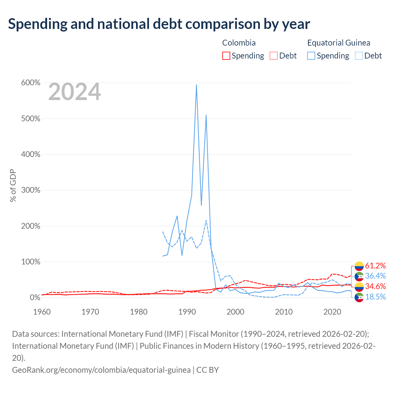 Colombia has $256B in government debt (61.2% of GDP), compared to $4.65B (36.4% of GDP) in Equatorial Guinea.