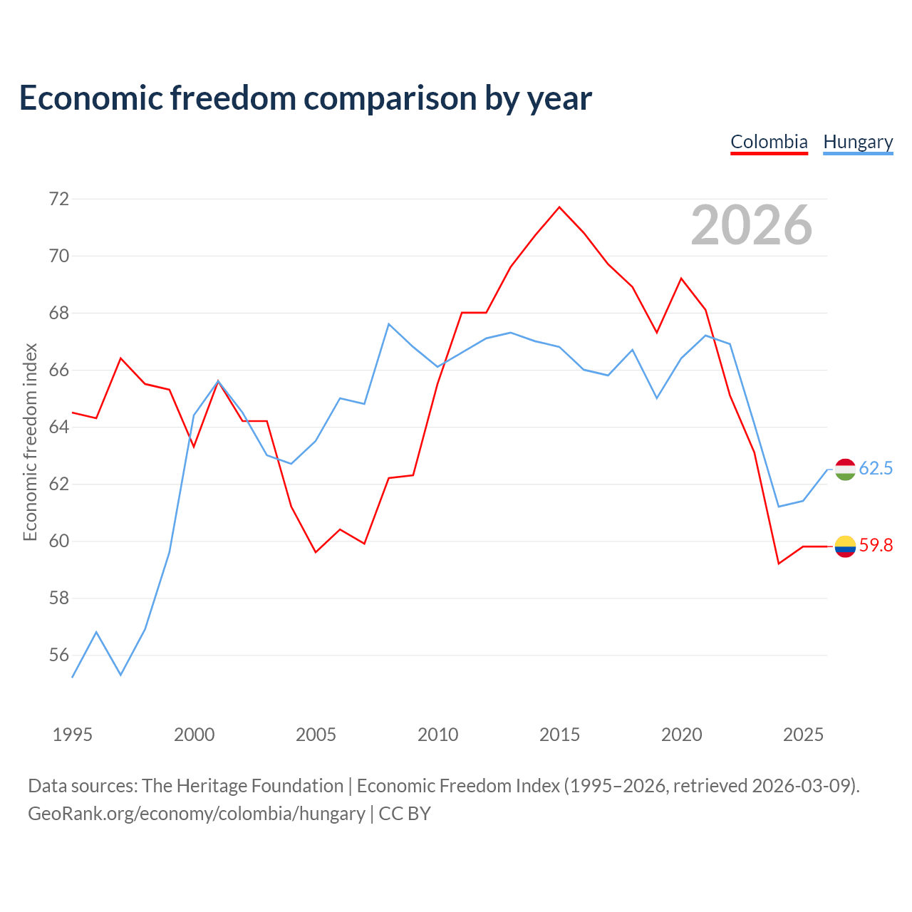 Data sources: The Heritage Foundation | Economic Freedom Index (1995–2026, retrieved 2026-03-09).