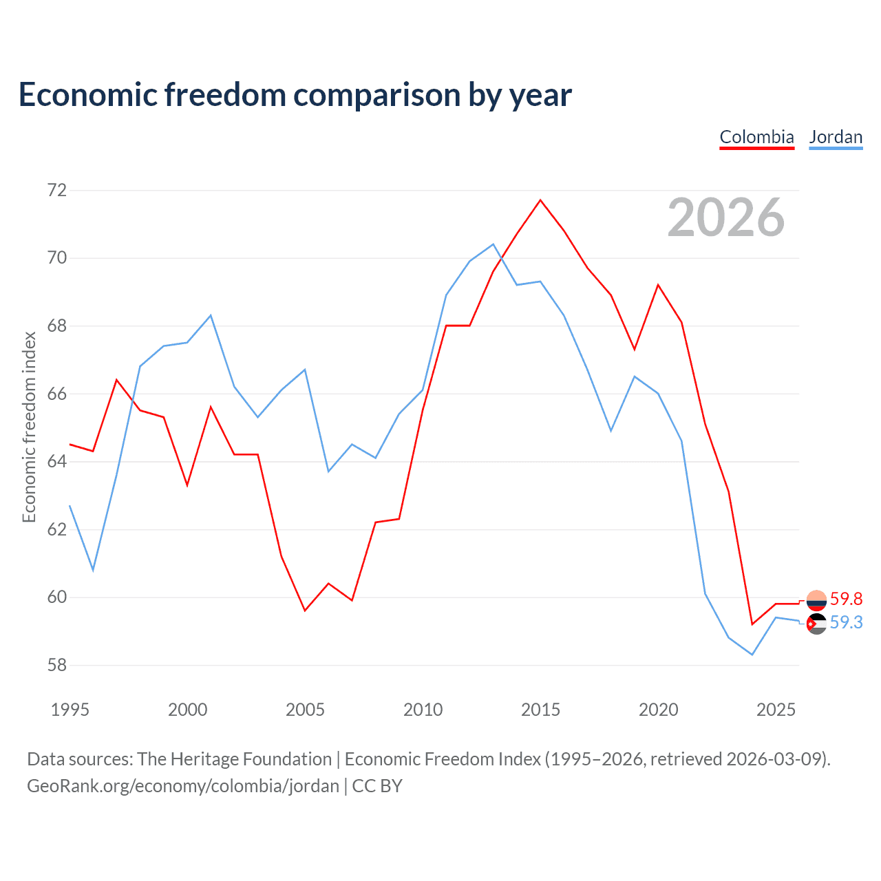 Data sources: The Heritage Foundation | Economic Freedom Index (1995–2026, retrieved 2026-03-09).