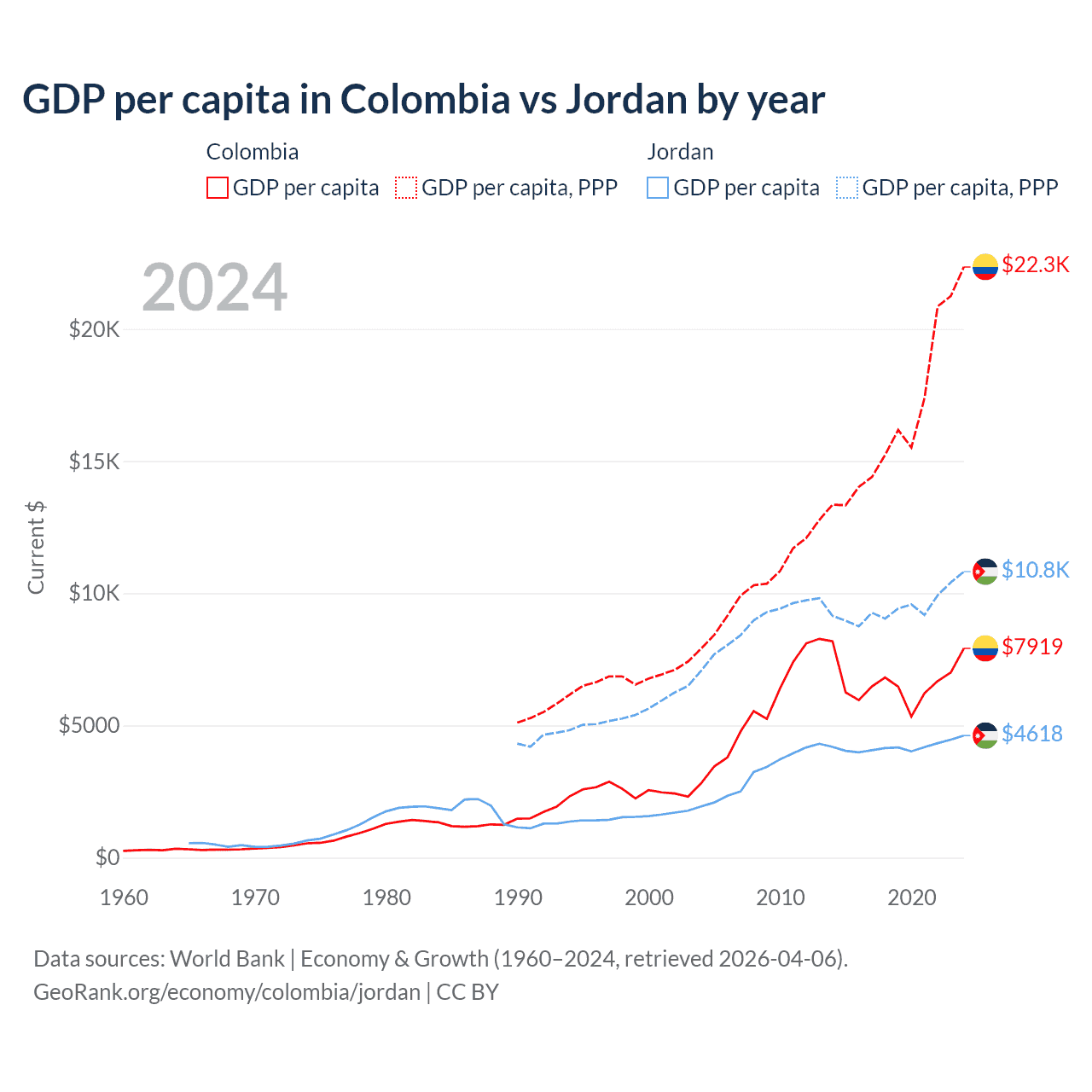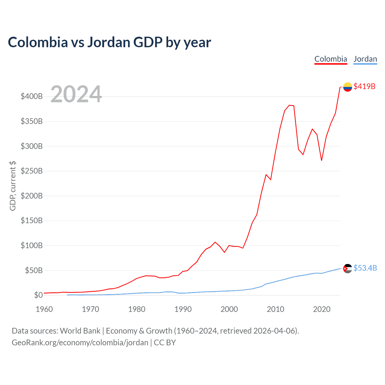 Colombia vs Jordan GDP by year