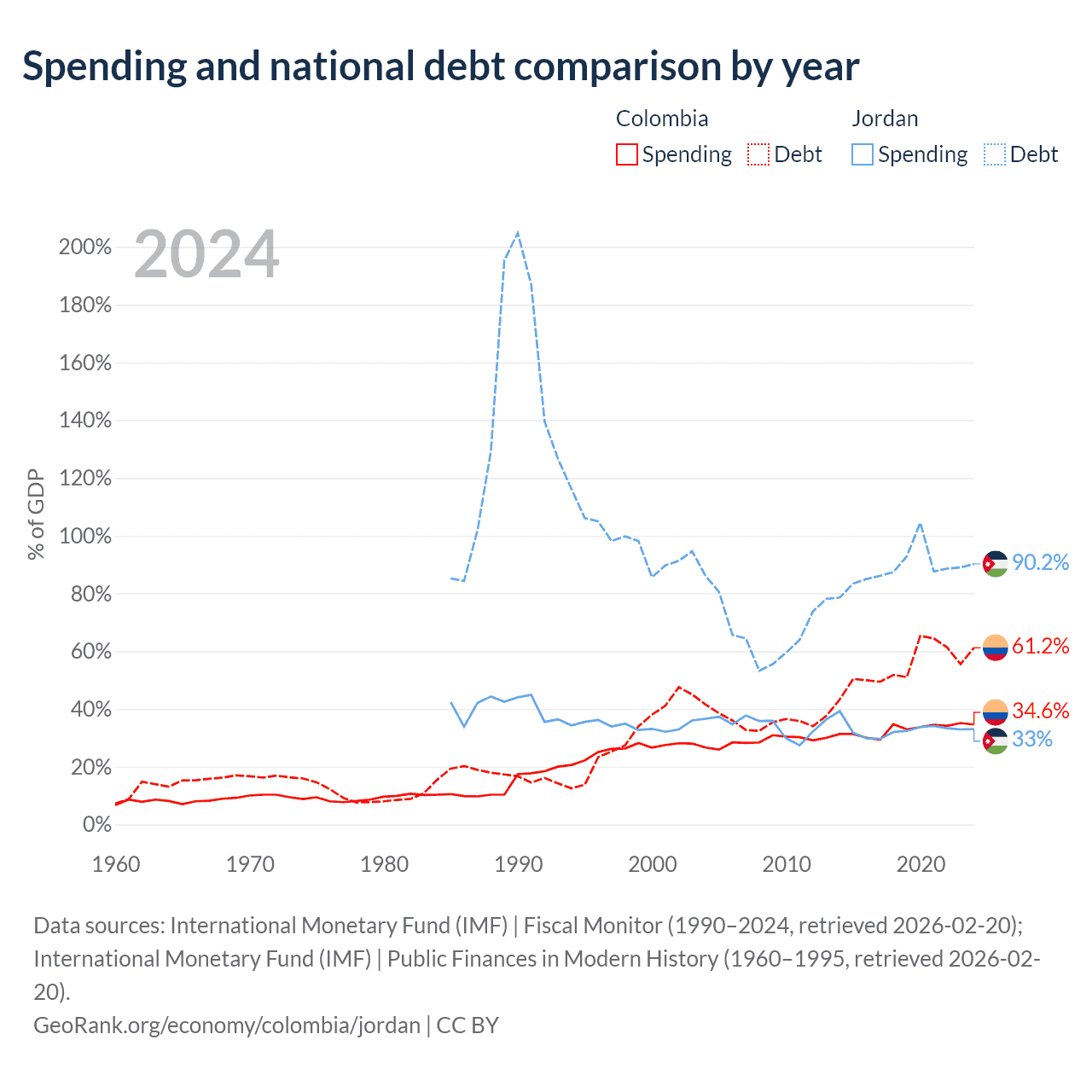 Colombia has $256B in government debt (61.2% of GDP), compared to $48.1B (90.2% of GDP) in Jordan.