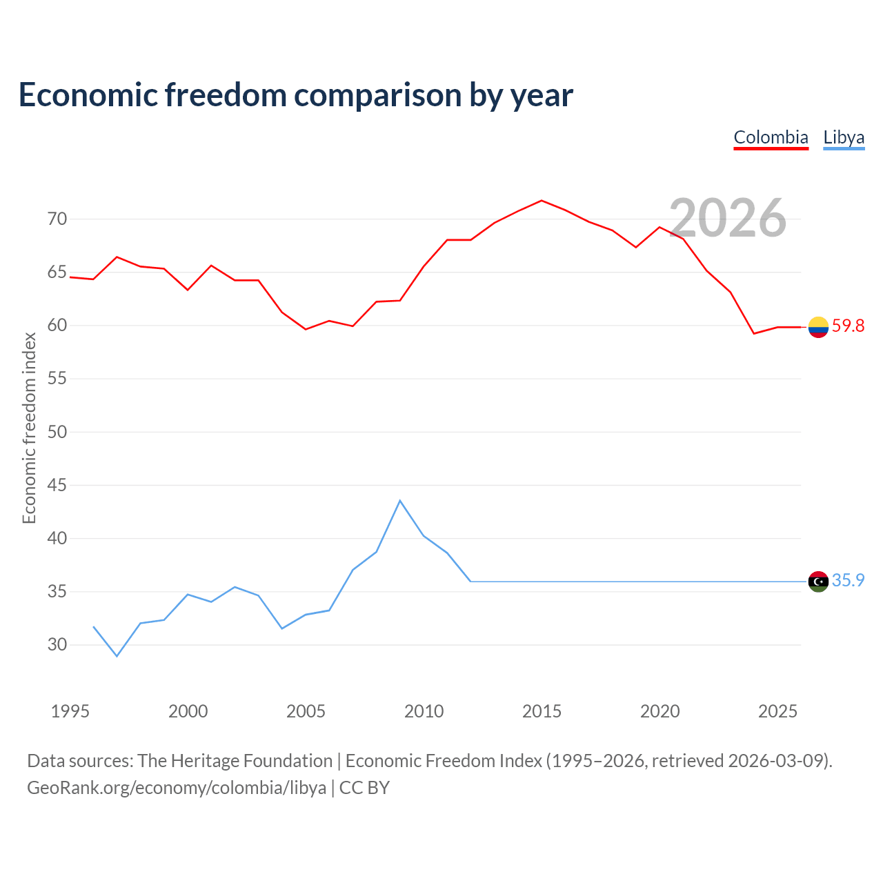 Data sources: The Heritage Foundation | Economic Freedom Index (1995–2026, retrieved 2026-03-09).
