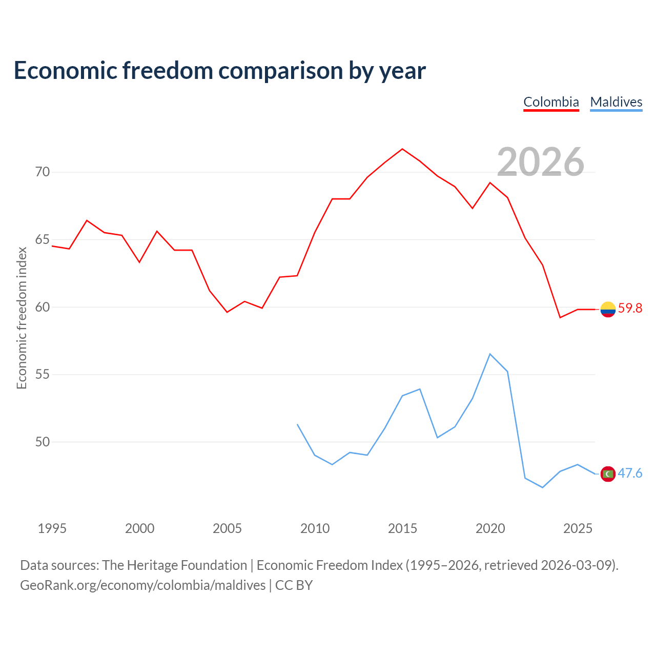 The Economic Freedom Index for Colombia is 59.8, ranking 101/197, compared to 47.6 for Maldives, ranking 174/197. The chart above displays a comparison of annual changes in economic freedom indexes.