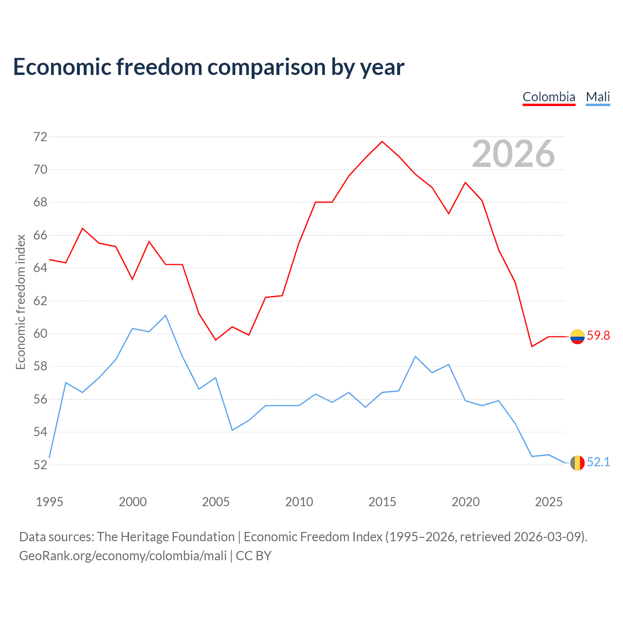 The Economic Freedom Index for Colombia is 59.8, ranking 101/197, compared to 52.1 for Mali, ranking 150/197. The chart above displays a comparison of annual changes in economic freedom indexes.