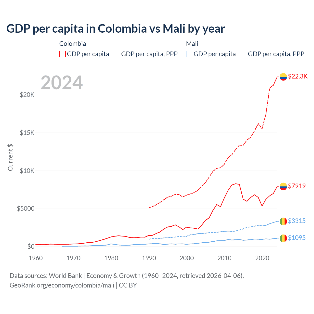 GDP per capita in Colombia vs Mali by year