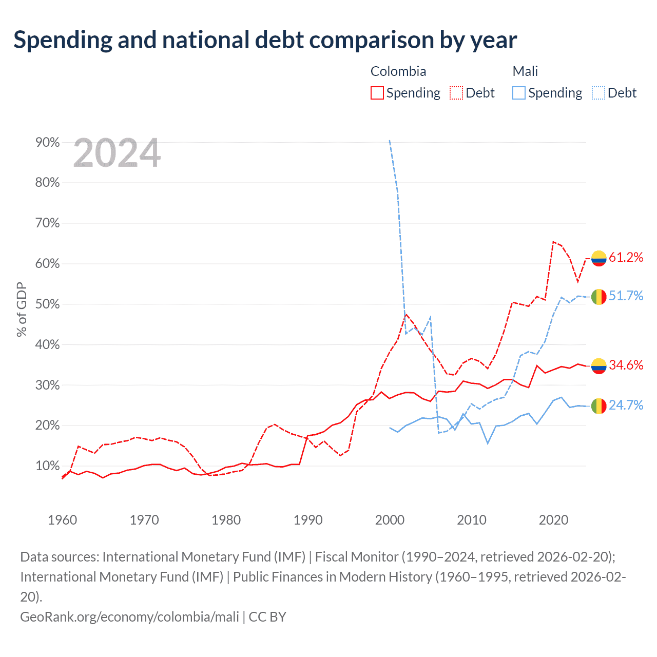 Colombia has $256B in government debt (61.2% of GDP), compared to $13.9B (51.7% of GDP) in Mali.